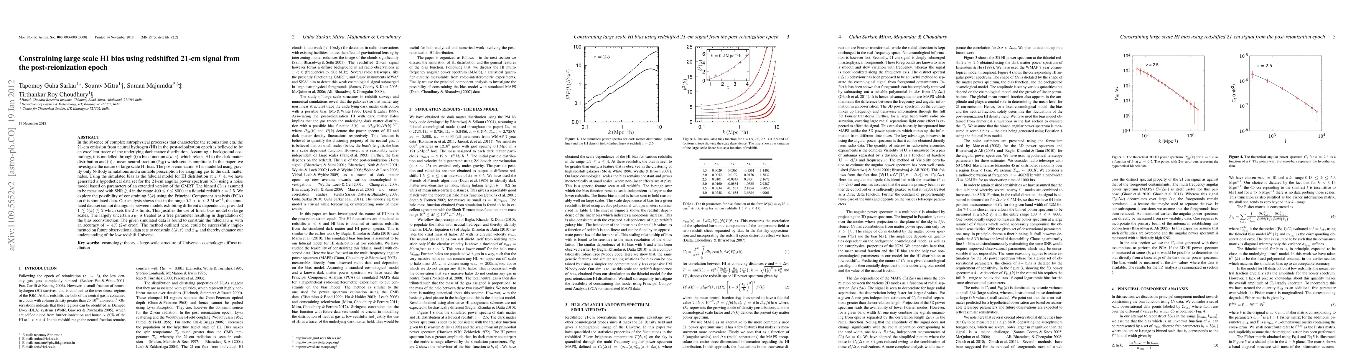 In the absence of complex astrophysical processes that characterize the reionization era, the 21-cm emission from neutral hydrogen (HI) in the post-reionization epoch is believed to be an excellent tracer of the underlying dark matter distribution. Assuming a background cosmology, it is modelled through (i) a bias function b(k,z), which relates HI to the dark matter distribution and (ii) a mean neutral fraction (x_{HI}) which sets its amplitude. In this paper, we investigate the nature of large scale HI bias. The post-reionization HI is modelled using gravity only N-Body simulations and a suitable prescription for assigning gas to the dark matter halos. Using the simulated bias as the fiducial model for HI distribution at z\leq 4, we have generated a hypothetical data set for the 21-cm angular power spectrum (C_{l}) using a noise model based on parameters of an extended version of the GMRT. The binned C_{l} is assumed to be measured with SNR \gtrsim 4 in the range 400 \leq l \leq 8000 at a fiducial redshift z=2.5. We explore the possibility of constraining b(k) using the Principal Component Analysis (PCA) on this simulated data. Our analysis shows that in the range 0.2 < k < 2 Mpc^{-1}, the simulated data set cannot distinguish between models exhibiting different k dependences, provided 1 \lesssim b(k) \lesssim 2 which sets the 2-sigma limits. This justifies the use of linear bias model on large scales. The largely uncertain x_{HI} is treated as a free parameter resulting in degradation of the bias reconstruction. The given simulated data is found to constrain the fiducial x_{HI} with an accuracy of \sim 4% (2-sigma error). The method outlined here, could be successfully implemented on future observational data sets to constrain b(k,z) and x_{HI} and thereby enhance our understanding of the low redshift Universe.
