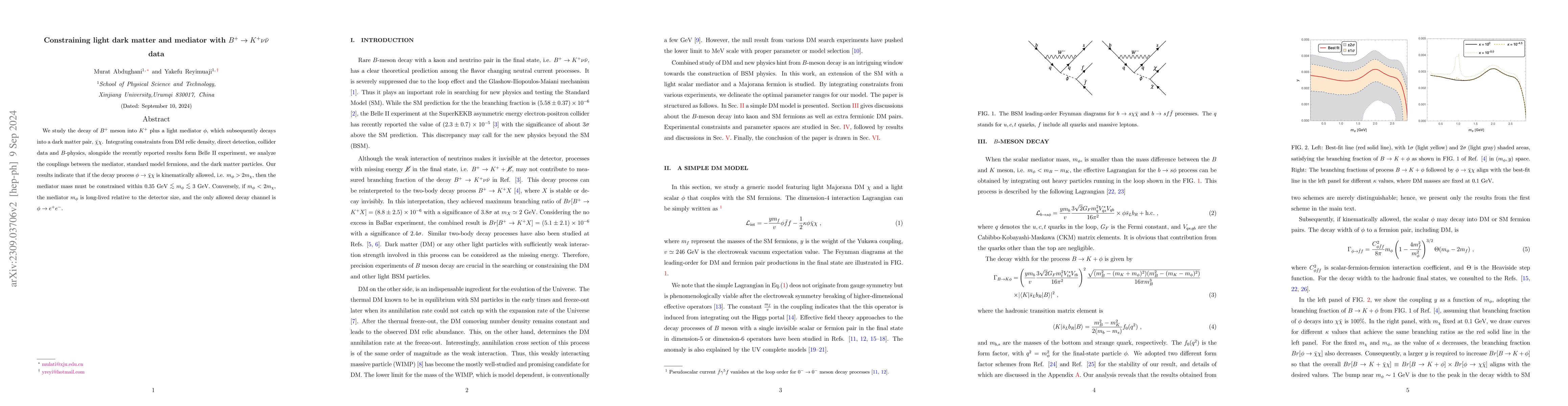This paper investigates the decay of $B^+$ mesons into $K^+$ plus a light mediator $\phi$ that produces dark matter pairs, constraining the mediator's mass and couplings using experimental data. It finds that if $\phi$ can decay into dark matter, its mass must exceed that of a muon pair.