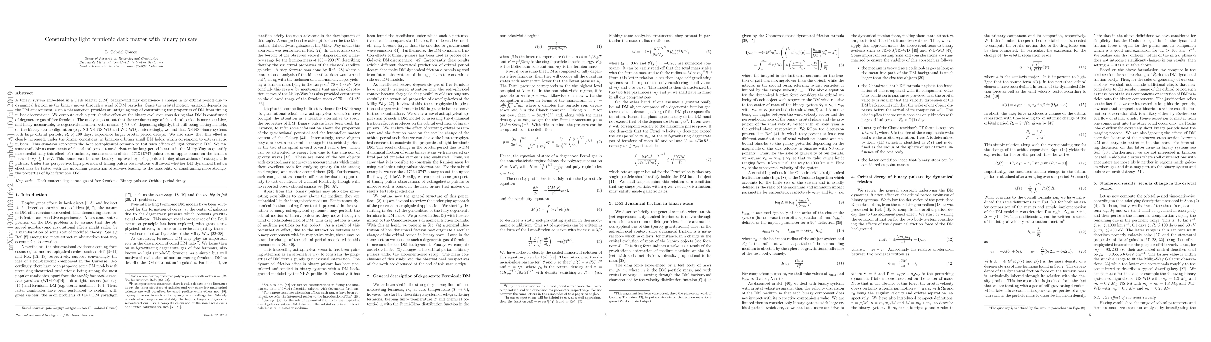 The paper presents a detailed calculation of the secular change in the orbital period of binary pulsar systems due to dynamical friction from light fermionic DM, using Chandrasekhar's formula and considering various binary configurations and DM halo sizes.