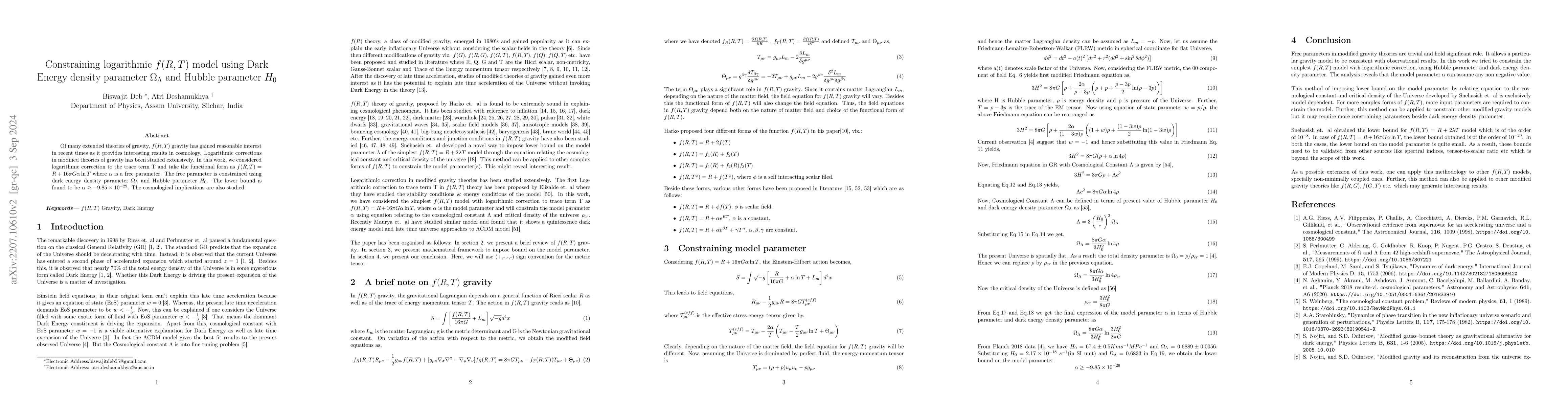 This paper explores the $f(R,T)$ gravity model with a logarithmic correction to the trace term, constraining the free parameter $\alpha$ using the dark energy density parameter $\Omega_{\Lambda}$ and Hubble parameter $H_0$. The study finds that $\alpha$ must be at least $- 9.93 \times 10^{-29}$ to be consistent with current cosmological observations.