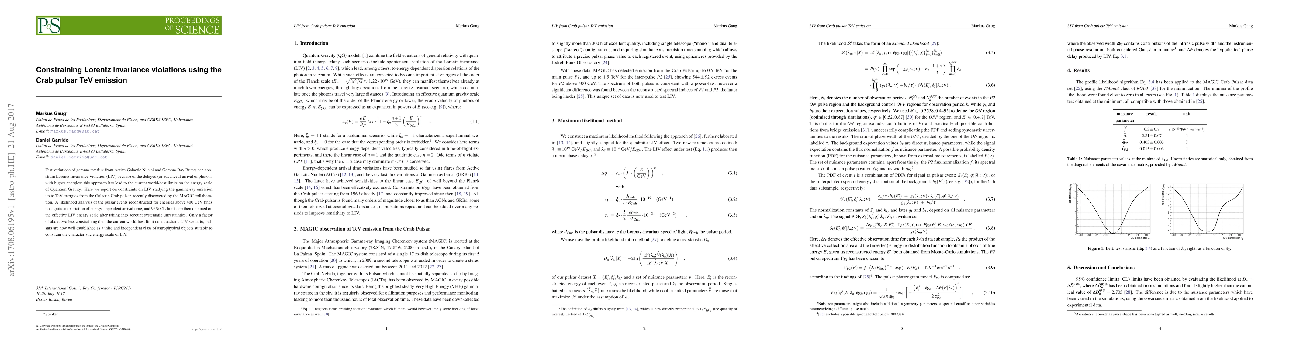This paper reports on constraints on Lorentz Invariance Violation (LIV) using the Crab pulsar's gamma-ray emission at TeV energies, finding no significant energy-dependent arrival time variation. Pulsars are now recognized as a third independent class for constraining the energy scale of LIV, nearly as effective as other methods.