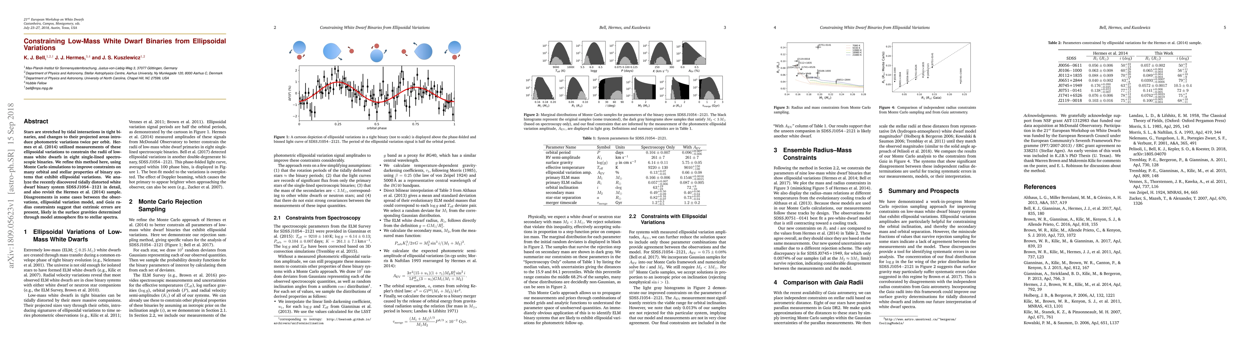 This paper refines the method to constrain the radii of low-mass white dwarfs in binary systems using ellipsoidal variations, employing Monte Carlo simulations for improved accuracy. It analyzes the newly discovered SDSS J1054-2121 and revisits Hermes et al.'s (2014) sample, highlighting discrepancies suggesting errors in surface gravity determinations from model atmosphere fits.