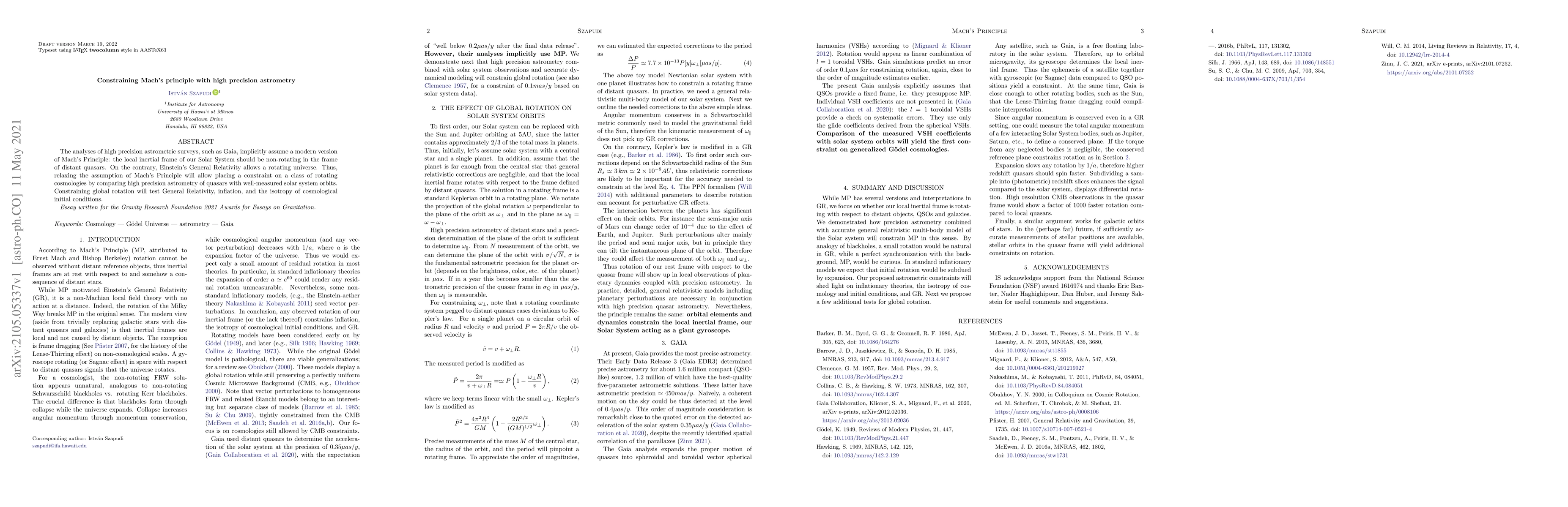 The analyses of high precision astrometric surveys, such as Gaia, implicitly assume a modern version of Mach's Principle: the local inertial frame of our Solar System should be non-rotating in the frame of distant quasars. On the contrary, Einstein's General Relativity allows a rotating universe. Thus, relaxing the assumption of Mach's Principle will allow placing a constraint on a class of rotating cosmologies by comparing high precision astrometry of quasars with well-measured solar system orbits. Constraining global rotation will test General Relativity, inflation, and the isotropy of cosmological initial conditions.