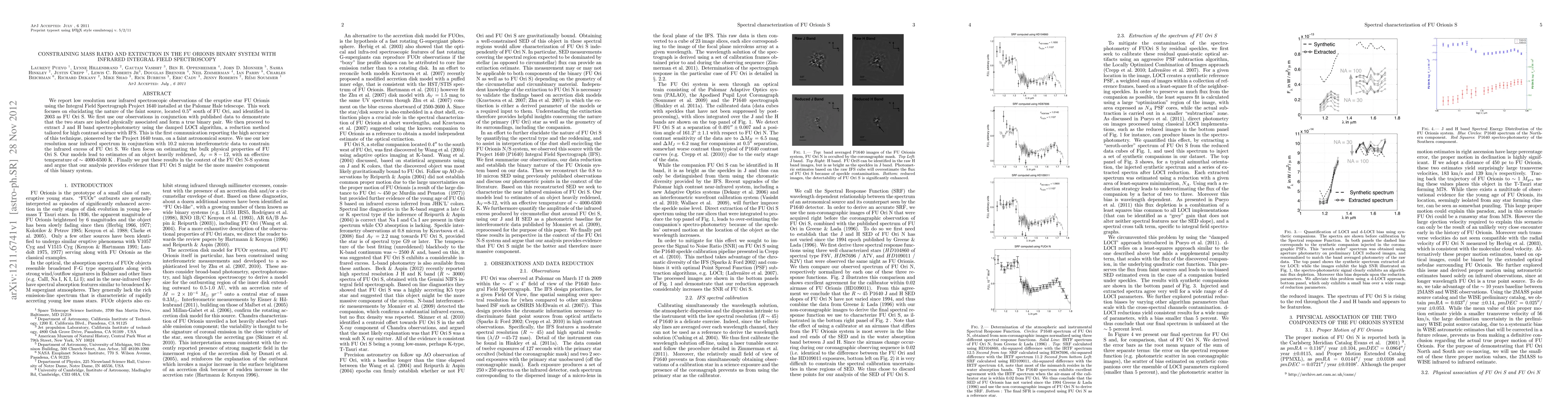 We report low resolution near infrared spectroscopic observations of the eruptive star FU Orionis using the Integral Field Spectrograph Project 1640 installed at the Palomar Hale telescope. This work focuses on elucidating the nature of the faint source, located 0.5" south of FU Ori, and identified in 2003 as FU Ori S. We first use our observations in conjunction with published data to demonstrate that the two stars are indeed physically associated and form a true binary pair. We then proceed to extract J and H band spectro-photometry using the damped LOCI algorithm, a reduction method tailored for high contrast science with IFS. This is the first communication reporting the high accuracy of this technique, pioneered by the Project 1640 team, on a faint astronomical source. We use our low resolution near infrared spectrum in conjunction with 10.2 micron interferometric data to constrain the infrared excess of FU Ori S. We then focus on estimating the bulk physical properties of FU Ori S. Our models lead to estimates of an object heavily reddened, A_V =8-12, with an effective temperature of ~ 4000-6500 K . Finally we put these results in the context of the FU Ori N-S system and argue that our analysis provides evidence that FU Ori S might be the more massive component of this binary system