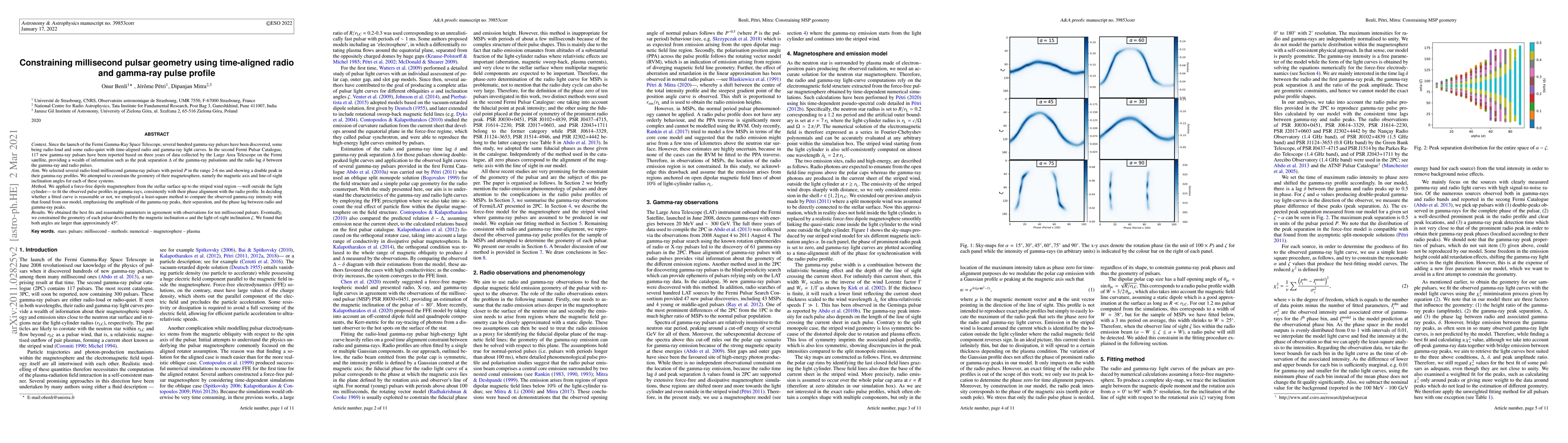 This research constrains the geometry of millisecond pulsars by aligning radio and gamma-ray pulse profiles. Using data from Fermi Gamma-Ray Space Telescope, the study fits a force-free dipole magnetosphere model to determine the magnetic and light-of-sight inclination angles, finding both to be greater than $45^{\rm o}$ for ten pulsars.