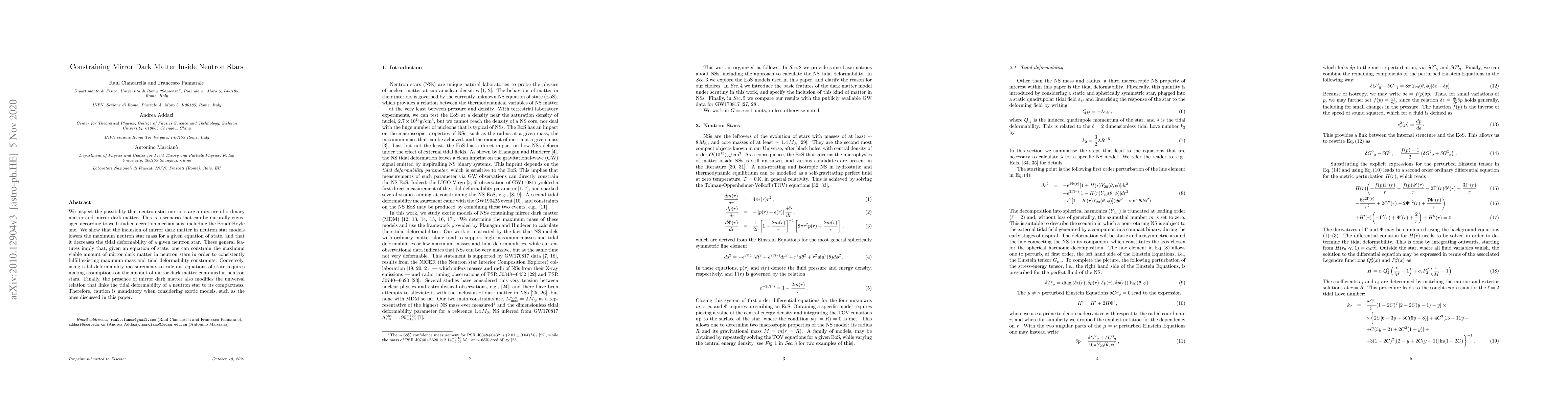 This paper explores neutron stars containing mirror dark matter, demonstrating that it reduces maximum mass and tidal deformability, thus constraining the amount of mirror dark matter to meet existing astrophysical limits. It also highlights the need for caution in interpreting tidal deformability measurements without considering the presence of mirror dark matter.