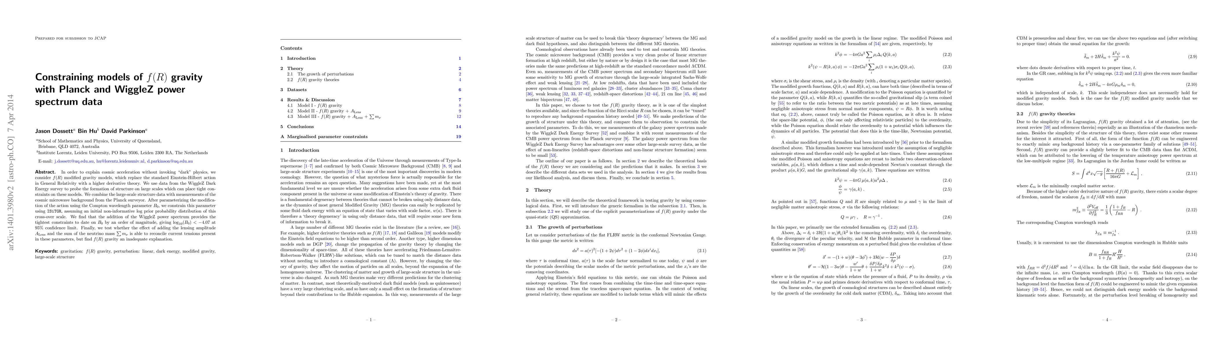 The research combines data from the WiggleZ and Planck surveys to constrain $f(R)$ gravity models, explaining cosmic acceleration without dark energy. Tighter constraints on the Compton wavelength parameter $B_0$ (< -4.07 at 95% CL) are found using WiggleZ, and $f(R)$ gravity is deemed inadequate to reconcile current tensions in other parameters.