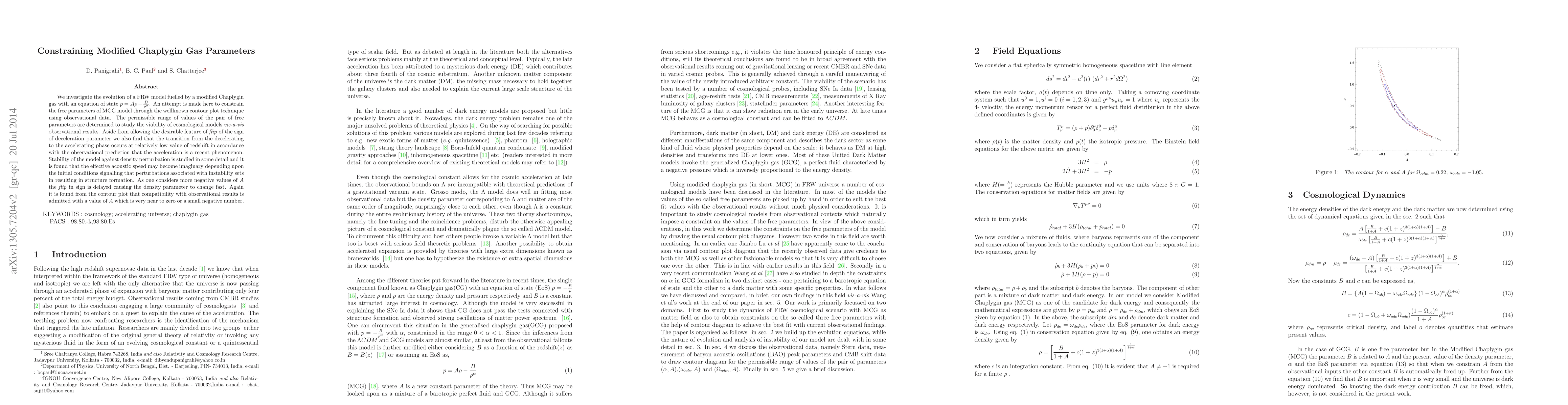 This research constrains parameters of a modified Chaplygin gas model using observational data, finding permissible ranges for model viability. It shows the model's compatibility with observational results when A is near zero or slightly negative, indicating recent cosmic acceleration and structure formation through instability.