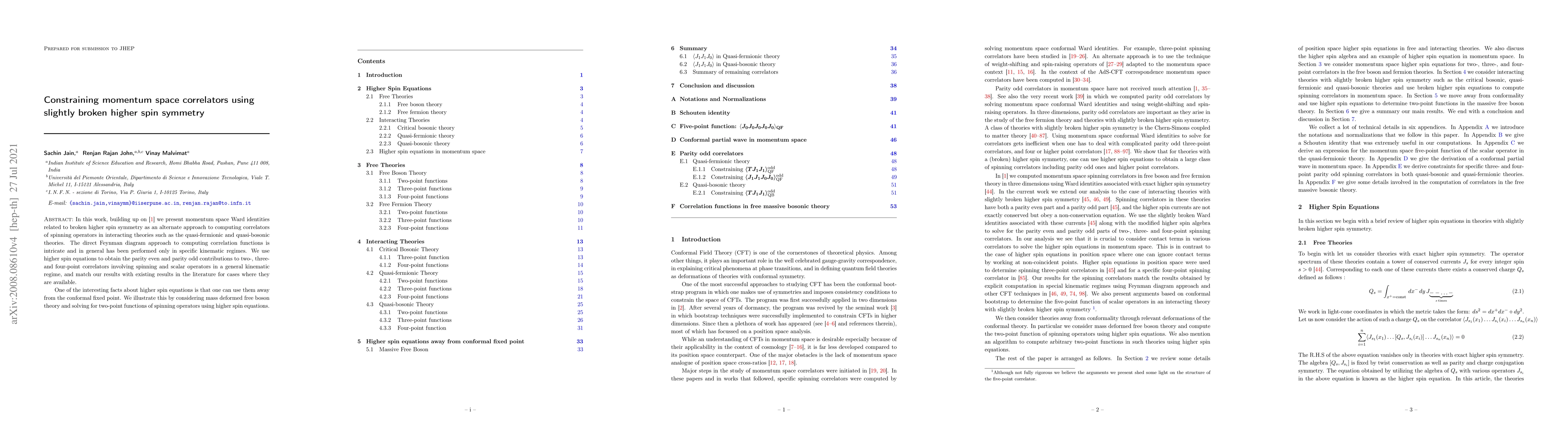 In this work, building up on [1] we present momentum space Ward identities related to broken higher spin symmetry as an alternate approach to computing correlators of spinning operators in interacting theories such as the quasi-fermionic and quasi-bosonic theories. The direct Feynman diagram approach to computing correlation functions is intricate and in general has been performed only in specific kinematic regimes. We use higher spin equations to obtain the parity even and parity odd contributions to two-, three- and four-point correlators involving spinning and scalar operators in a general kinematic regime, and match our results with existing results in the literature for cases where they are available. One of the interesting facts about higher spin equations is that one can use them away from the conformal fixed point. We illustrate this by considering mass deformed free boson theory and solving for two-point functions of spinning operators using higher spin equations.