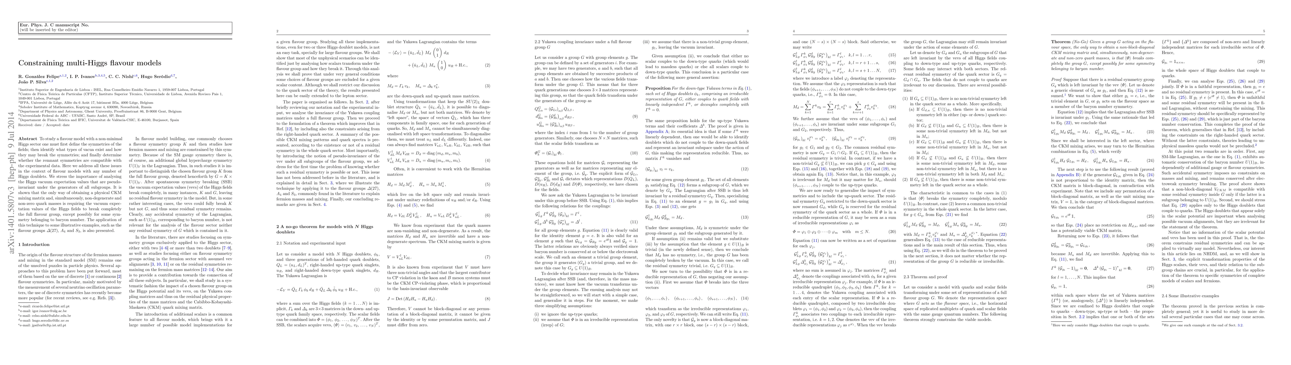 To study a flavour model with a non-minimal Higgs sector one must first define the symmetries of the fields; then identify what types of vacua exist and how they may break the symmetries; and finally determine whether the remnant symmetries are compatible with the experimental data. Here we address all these issues in the context of flavour models with any number of Higgs doublets. We stress the importance of analysing the Higgs vacuum expectation values that are pseudo-invariant under the generators of all subgroups. It is shown that the only way of obtaining a physical CKM mixing matrix and, simultaneously, non-degenerate and non-zero quark masses is requiring the vacuum expectation values of the Higgs fields to break completely the full flavour group, except possibly for some symmetry belonging to baryon number. The application of this technique to some illustrative examples, such as the flavour groups Delta(27), A4 and S3, is also presented.
