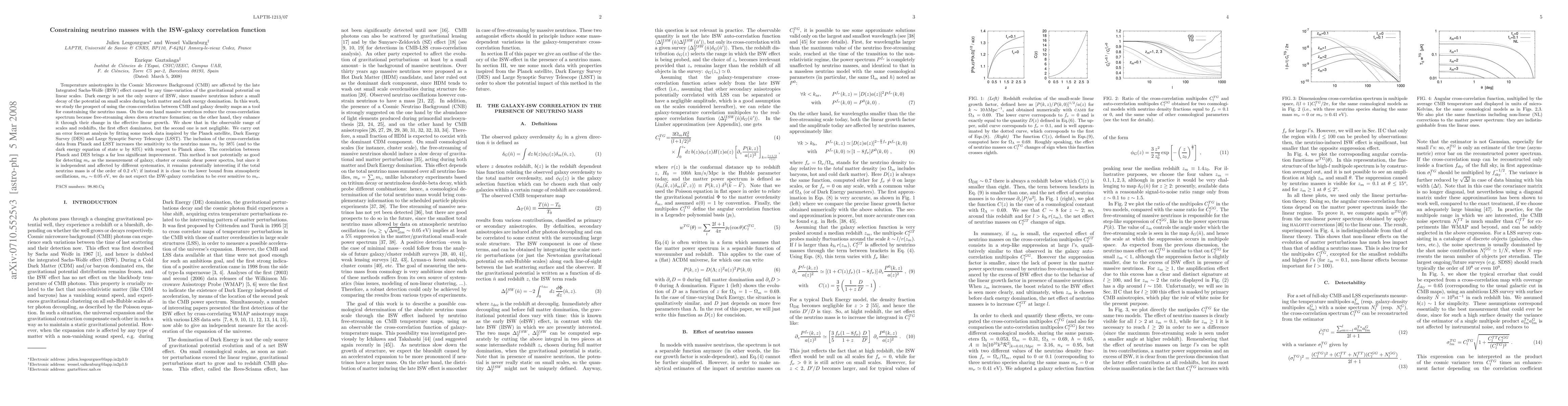 Temperature anisotropies in the Cosmic Microwave Background (CMB) are affected by the late Integrated Sachs-Wolfe (lISW) effect caused by any time-variation of the gravitational potential on linear scales. Dark energy is not the only source of lISW, since massive neutrinos induce a small decay of the potential on small scales during both matter and dark energy domination. In this work, we study the prospect of using the cross-correlation between CMB and galaxy density maps as a tool for constraining the neutrino mass. On the one hand massive neutrinos reduce the cross-correlation spectrum because free-streaming slows down structure formation; on the other hand, they enhance it through their change in the effective linear growth. We show that in the observable range of scales and redshifts, the first effect dominates, but the second one is not negligible. We carry out an error forecast analysis by fitting some mock data inspired by the Planck satellite, Dark Energy Survey (DES) and Large Synoptic Survey Telescope (LSST). The inclusion of the cross-correlation data from Planck and LSST increases the sensitivity to the neutrino mass m_nu by 38% (and to the dark energy equation of state w by 83%) with respect to Planck alone. The correlation between Planck and DES brings a far less significant improvement. This method is not potentially as good for detecting m_nu as the measurement of galaxy, cluster or cosmic shear power spectra, but since it is independent and affected by different systematics, it remains potentially interesting if the total neutrino mass is of the order of 0.2 eV; if instead it is close to the lower bound from atmospheric oscillations, m_nu ~ 0.05 eV, we do not expect the ISW-galaxy correlation to be ever sensitive to m_nu.