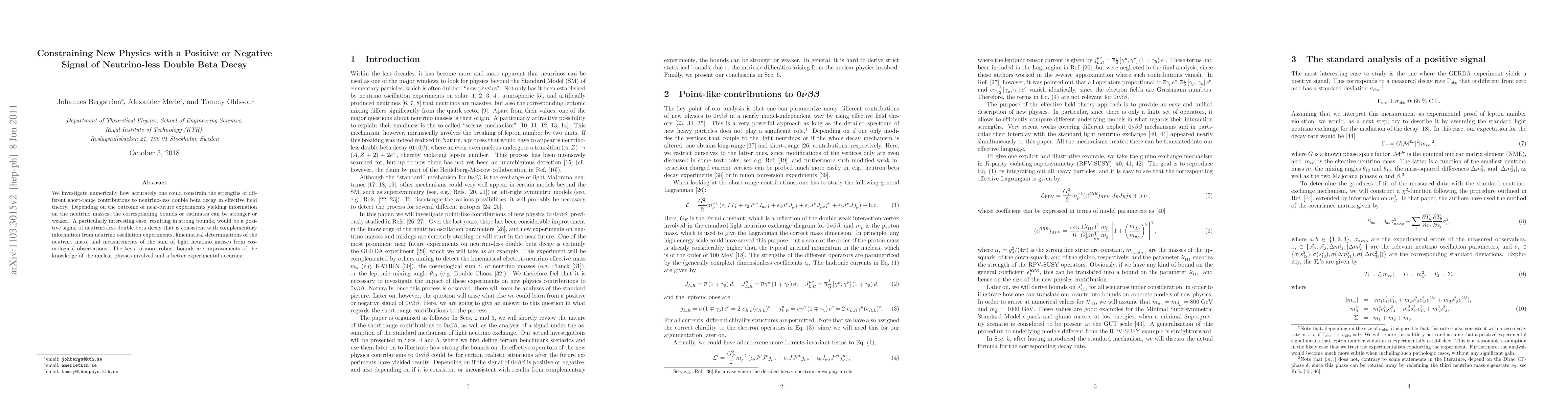 This paper numerically explores the potential to constrain new physics through the detection of neutrino-less double beta decay, emphasizing the importance of both experimental accuracy and nuclear physics knowledge for stronger bounds. A positive signal consistent with other neutrino data could lead to particularly stringent constraints on short-range contributions.