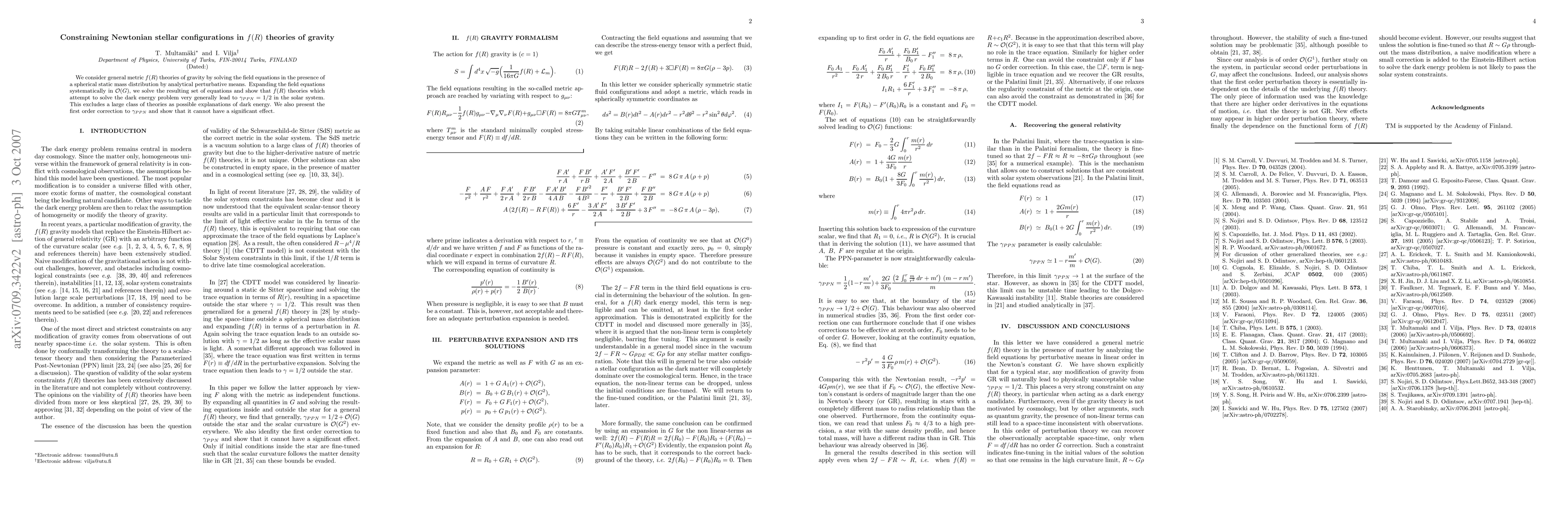 We consider general metric $f(R)$ theories of gravity by solving the field equations in the presence of a spherical static mass distribution by analytical perturbative means. Expanding the field equations systematically in $\cO(G)$, we solve the resulting set of equations and show that $f(R)$ theories which attempt to solve the dark energy problem very generally lead to $\gamma_{PPN}=1/2$ in the solar system. This excludes a large class of theories as possible explanations of dark energy. We also present the first order correction to $\gamma_{PPN}$ and show that it cannot have a significant effect.