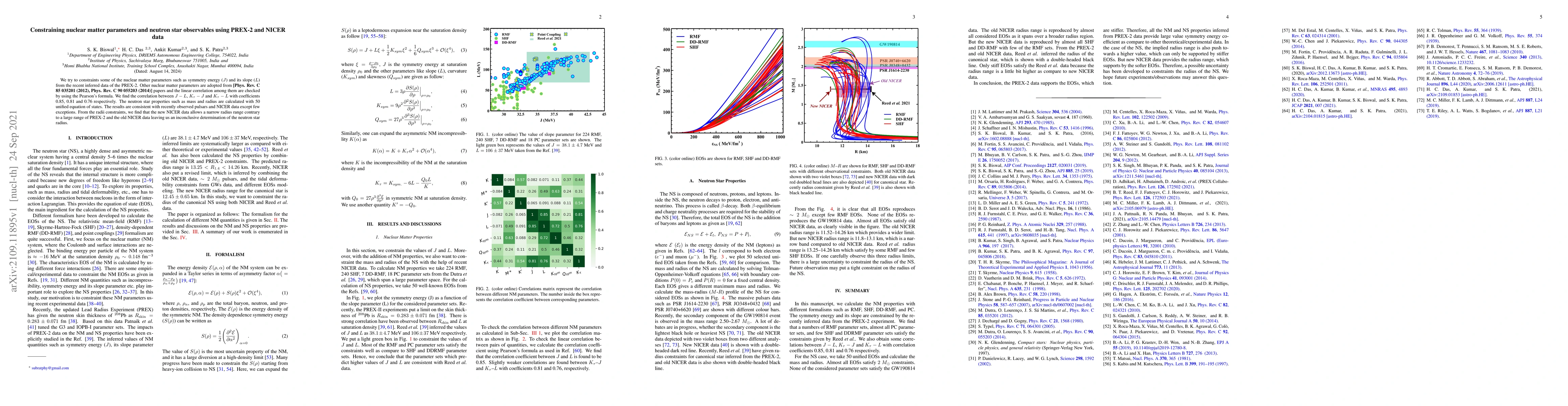 We try to constraints some of the nuclear matter parameters such as symmetry energy ($J$) and its slope ($L$) from the recent inferred data of the PREX-2. Other nuclear matter parameters are adopted from {\bf [Phys. Rev. C 85 035201 (2012), Phys. Rev. C 90 055203 (2014)]} papers and the linear correlation among them are checked by using the Pearson's formula. We find the correlation between $J-L$, $K_\tau-J$ and $K_\tau-L$ with coefficients 0.85, 0.81 and 0.76 respectively. The neutron star properties such as mass and radius are calculated with 50 unified equation of states. The results are consistent with recently observed pulsars and NICER data except few exceptions. From the radii constraints, we find that the new NICER data allows a narrow radius range contrary to a large range of PREX-2 and the old NICER data leaving us an inconclusive determination of the neutron star radius.