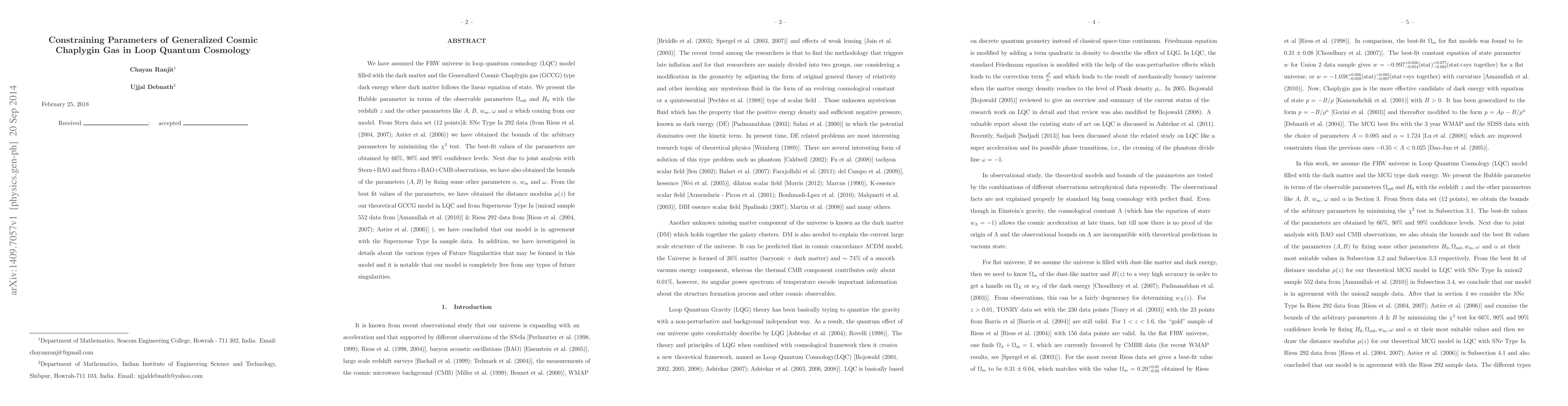 We have assumed the FRW universe in loop quantum cosmology (LQC) model filled with the dark matter and the Generalized Cosmic Chaplygin gas (GCCG) type dark energy where dark matter follows the linear equation of state. We present the Hubble parameter in terms of the observable parameters $\Omega_{m0}$ and $H_{0}$ with the redshift $z$ and the other parameters like $A$, $B$, $w_{m}$, $ \omega$ and $\alpha$ which coming from our model. From Stern data set (12 points)\& SNe Type Ia 292 data (from \cite{Riess1,Riess2,Astier}) we have obtained the bounds of the arbitrary parameters by minimizing the $\chi^{2}$ test. The best-fit values of the parameters are obtained by 66\%, 90\% and 99\% confidence levels. Next due to joint analysis with Stern+BAO and Stern+BAO+CMB observations, we have also obtained the bounds of the parameters ($A,B$) by fixing some other parameters $\alpha$, $w_{m}$ and $\omega$. From the best fit values of the parameters, we have obtained the distance modulus $\mu(z)$ for our theoretical GCCG model in LQC and from Supernovae Type Ia (union2 sample 552 data from [\cite{Amanullah}] \& Riess 292 data from [\cite{Riess1,Riess2,Astier}]), we have concluded that our model is in agreement with the Supernovae Type Ia sample data. In addition, we have investigated in details about the various types of Future Singularities that may be formed in this model and it is notable that our model is completely free from any types of future singularities.
