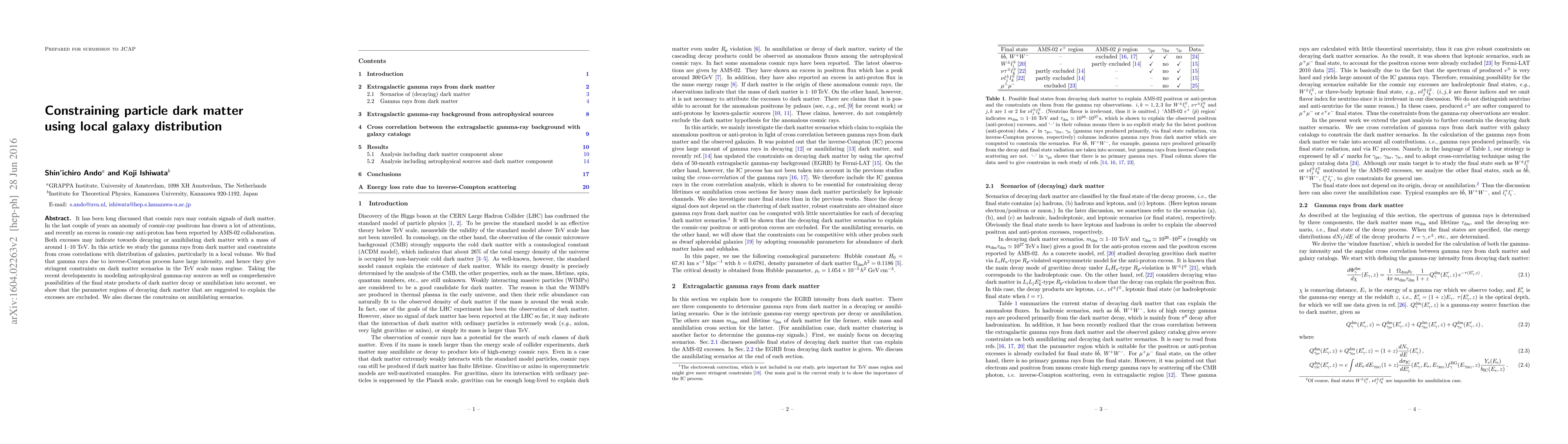It has been long discussed that cosmic rays may contain signals of dark matter. In the last couple of years an anomaly of cosmic-ray positrons has drawn a lot of attentions, and recently an excess in cosmic-ray anti-proton has been reported by AMS-02 collaboration. Both excesses may indicate towards decaying or annihilating dark matter with a mass of around 1-10 TeV. In this article we study the gamma rays from dark matter and constraints from cross correlations with distribution of galaxies, particularly in a local volume. We find that gamma rays due to inverse-Compton process have large intensity, and hence they give stringent constraints on dark matter scenarios in the TeV scale mass regime. Taking the recent developments in modeling astrophysical gamma-ray sources as well as comprehensive possibilities of the final state products of dark matter decay or annihilation into account, we show that the parameter regions of decaying dark matter that are suggested to explain the excesses are excluded. We also discuss the constrains on annihilating scenarios.