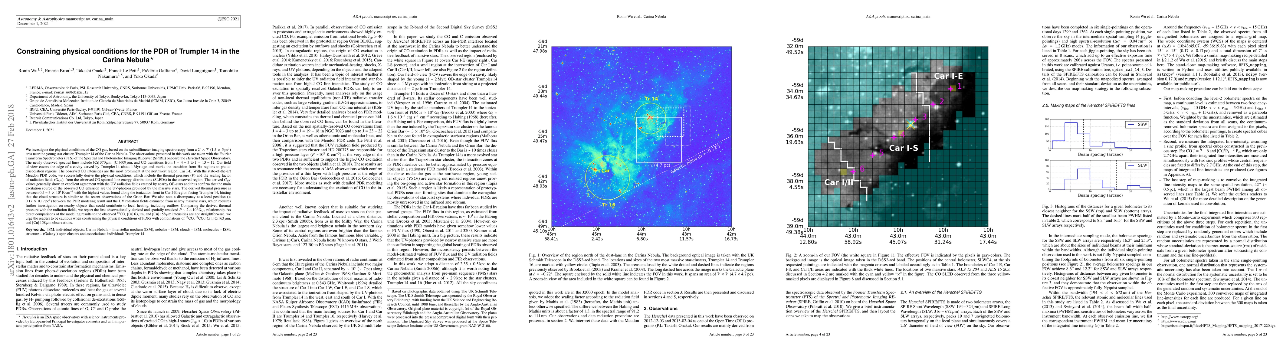 We investigate the physical conditions of the CO gas near the young star cluster, Trumpler 14 of the Carina Nebula. The observations presented in this work are taken with the Fourier Transform Spectrometer (FTS) of the Spectral and Photometric Imaging REceiver (SPIRE) onboard the Herschel Space Observatory. Our field of view covers the edge of a cavity carved by Trumpler 14 about $1\,\mathrm{Myr}$ ago and marks the transition from HII regions to photo-dissociation regions. With the state-of-the-art Meudon PDR code, we successfully derive the physical conditions, which include the thermal pressure ($P$) and the scaling factor of radiation fields ($G_{\mathrm{UV}}$), from the observed CO spectral line energy distributions~(SLEDs) in the observed region. The derived $G_{\mathrm{UV}}$ values generally show an excellent agreement with the UV radiation fields created by nearby OB-stars and thus confirm that the main excitation source of the observed CO emission are the UV-photons provided by the massive stars. The derived thermal pressure is between $0.5-3\,\times\,10^{8}\,\mathrm{K\,cm^{-3}}$ with the highest values found along the ionization front in Car I-E region facing Trumpler 14, hinting that the cloud structure is similar to the recent observations of the Orion Bar. Comparing the derived thermal pressure with the radiation fields, we report the first observationally-derived and spatially-resolved $P \sim 2\times10^4\,G_{\mathrm{UV}}$ relationship. As direct comparisons of the modeling results to the observed $^{13}\mathrm{CO}$, [OI] $63\,\mathrm{\mu m}$, and [CII] $158\,\mathrm{\mu m}$ intensities are not straightforward, we urge the readers to be cautious when constraining the physical conditions of PDRs with combinations of $^{12}\mathrm{CO}$, $^{13}\mathrm{CO}$, [CI], [OI] $63\,\mathrm{\mu m}$, and [CII] $158\,\mathrm{\mu m}$ observations.