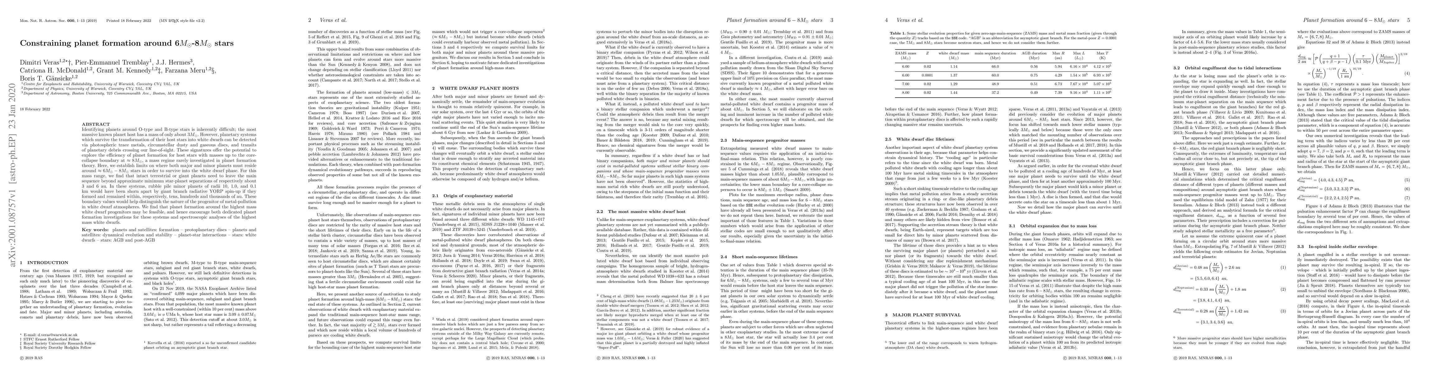 Research sets limits on planet formation around 6-8M\odot stars, finding that planets must leave main sequence beyond certain distances to survive into white dwarf phase.
