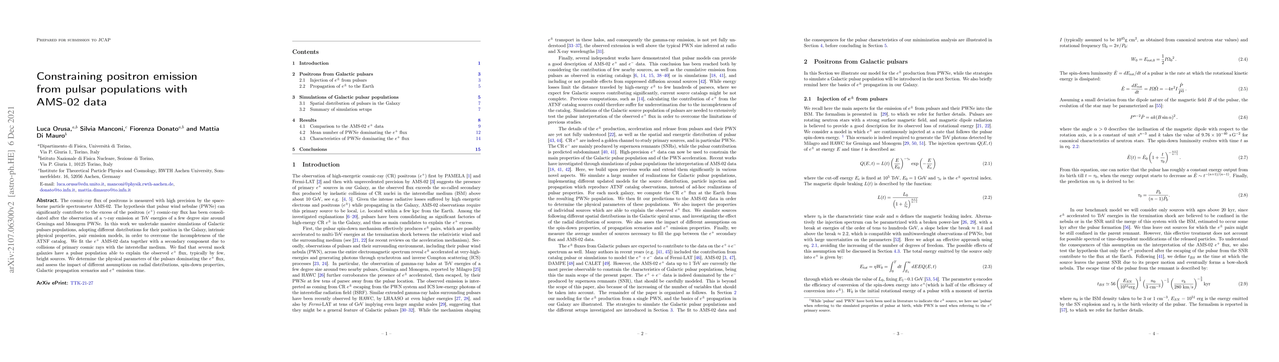 The cosmic-ray flux of positrons is measured with high precision by the space-borne particle spectrometer AMS-02. The hypothesis that pulsar wind nebulae (PWNe) can significantly contribute to the excess of the positron ($e^+$) cosmic-ray flux has been consolidated after the observation of a $\gamma$-ray emission at TeV energies of a few degree size around Geminga and Monogem PWNe. In this work we undertake massive simulations of Galactic pulsars populations, adopting different distributions for their position in the Galaxy, intrinsic physical properties, pair emission models, in order to overcome the incompleteness of the ATNF catalog. We fit the $e^+$ AMS-02 data together with a secondary component due to collisions of primary cosmic rays with the interstellar medium. We find that several mock galaxies have a pulsar population able to explain the observed $e^+$ flux, typically by few, bright sources. We determine the physical parameters of the pulsars dominating the $e^+$ flux, and assess the impact of different assumptions on radial distributions, spin-down properties, Galactic propagation scenarios and $e^+$ emission time.