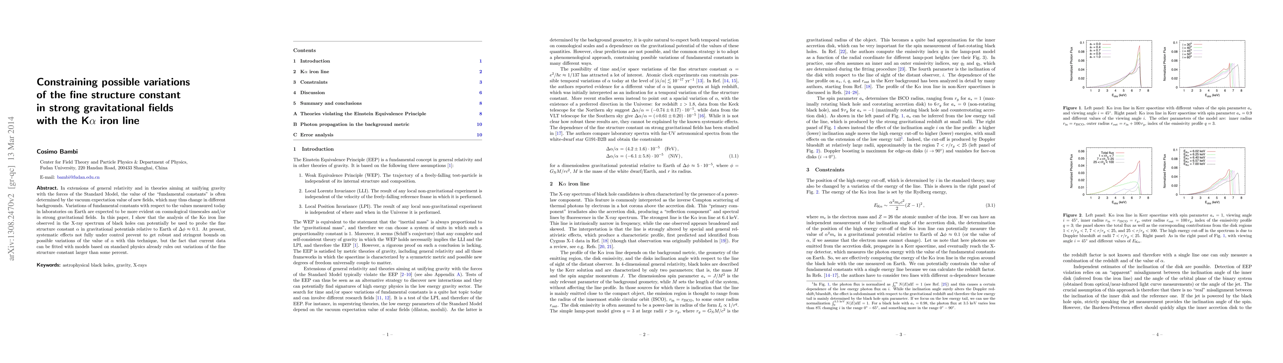 This paper explores the potential of X-ray spectroscopy of black holes to constrain variations in the fine structure constant in strong gravitational fields. While current data allows fitting with standard physics models, it does not yet provide stringent bounds on such variations, but rules out changes larger than a few percent.