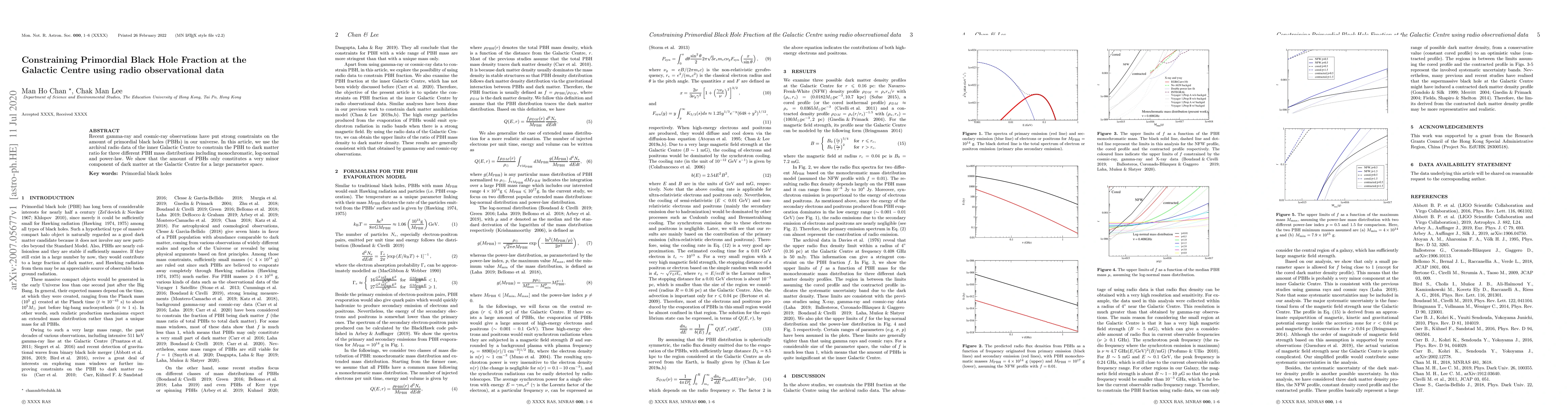 This paper uses archival radio data from the inner Galactic Centre to constrain the fraction of primordial black holes (PBHs) in the region's dark matter. The study finds that PBHs constitute a minor component of dark matter for various PBH mass distributions, reinforcing existing constraints from gamma-ray and cosmic-ray observations.
