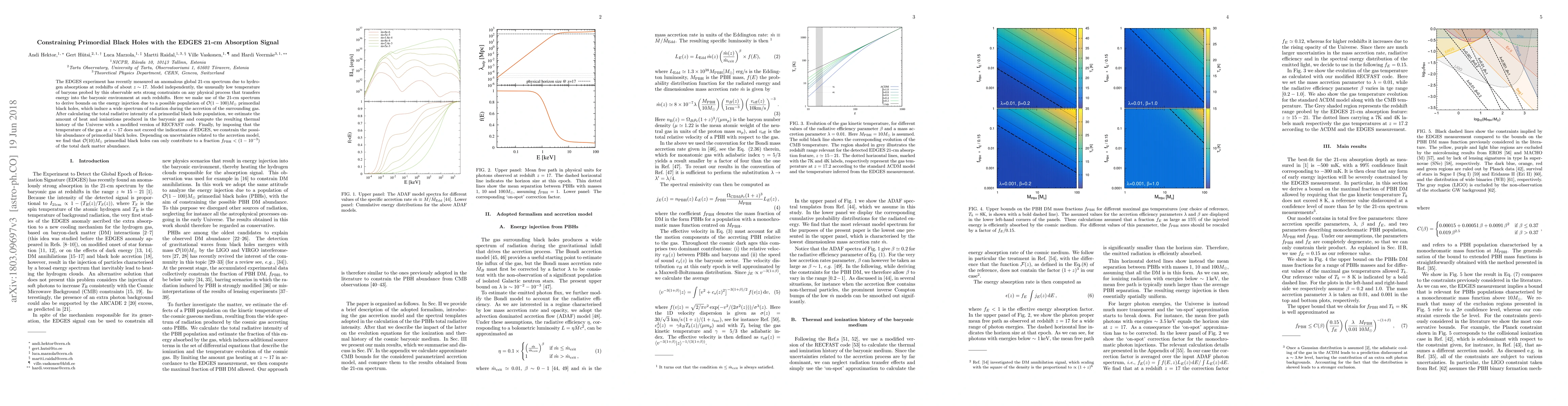 A study uses the EDGES 21-cm absorption signal to constrain the presence of primordial black holes with masses between 1-100 solar masses, finding that only a small fraction (less than 0.01%) could contribute to dark matter abundance.