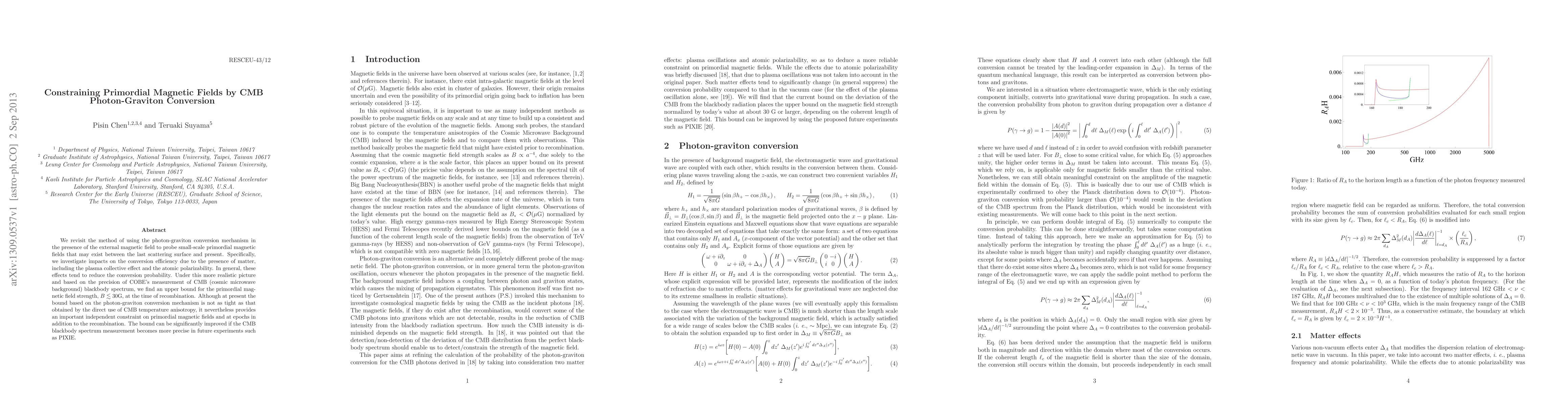 This paper investigates the photon-graviton conversion mechanism in the presence of external magnetic fields to constrain primordial magnetic fields, finding an upper limit of B < 30G at the time of recombination. While not as stringent as direct CMB temperature anisotropy measurements, this method provides an independent constraint and could improve with more precise CMB spectrum measurements.