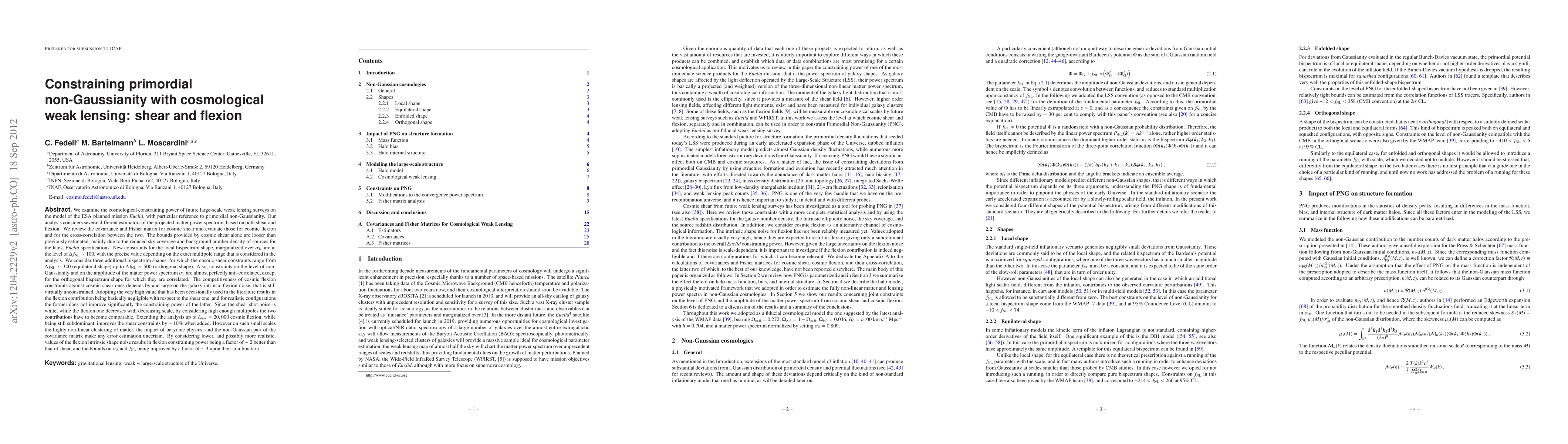 We examine the cosmological constraining power of future large-scale weak lensing surveys on the model of \emph{Euclid}, with particular reference to primordial non-Gaussianity. Our analysis considers several different estimators of the projected matter power spectrum, based on both shear and flexion, for which we review the covariances and Fisher matrices. The bounds provided by cosmic shear alone for the local bispectrum shape, marginalized over $\sigma_8$, are at the level of $\Delta f_\mathrm{NL} \sim 100$. We consider three additional bispectrum shapes, for which the cosmic shear constraints range from $\Delta f_\mathrm{NL}\sim 340$ (equilateral shape) up to $\Delta f_\mathrm{NL}\sim 500$ (orthogonal shape). The competitiveness of cosmic flexion constraints against cosmic shear ones depends on the galaxy intrinsic flexion noise, that is still virtually unconstrained. Adopting the very high value that has been occasionally used in the literature results in the flexion contribution being basically negligible with respect to the shear one, and for realistic configurations the former does not improve significantly the constraining power of the latter. Since the flexion noise decreases with decreasing scale, by extending the analysis up to $\ell_\mathrm{max} = 20,000$ cosmic flexion, while being still subdominant, improves the shear constraints by $\sim 10%$ when added. However on such small scales the highly non-linear clustering of matter and the impact of baryonic physics make any error estimation uncertain. By considering lower, and possibly more realistic, values of the flexion intrinsic shape noise results in flexion constraining power being a factor of $\sim 2$ better than that of shear, and the bounds on $\sigma_8$ and $f_\mathrm{NL}$ being improved by a factor of $\sim 3$ upon their combination. (abridged)