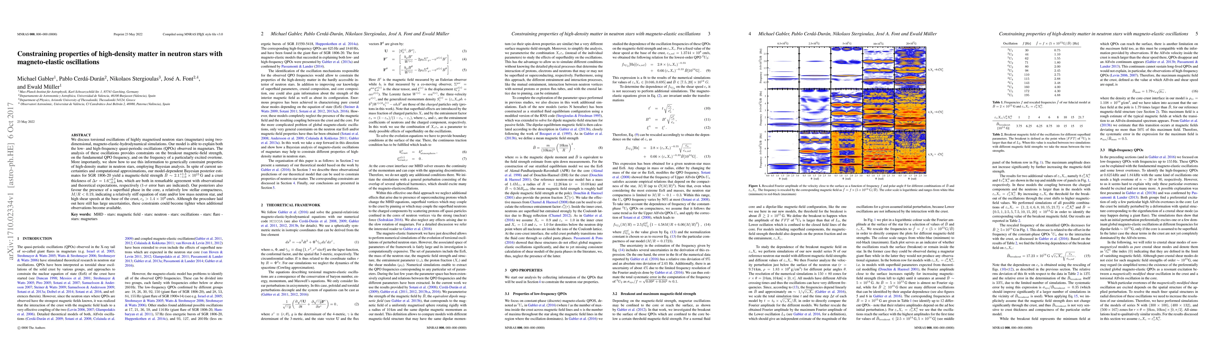 We discuss torsional oscillations of highly magnetised neutron stars (magnetars) using two-dimensional, magneto-elastic-hydrodynamical simulations. Our model is able to explain both the low- and high-frequency quasi-periodic oscillations (QPOs) observed in magnetars. The analysis of these oscillations provides constraints on the breakout magnetic-field strength, on the fundamental QPO frequency, and on the frequency of a particularly excited overtone. More importantly, we show how to use this information to generically constraint properties of high-density matter in neutron stars, employing Bayesian analysis. In spite of current uncertainties and computational approximations, our model-dependent Bayesian posterior estimates for SGR 1806-20 yield a magnetic-field strength $\bar B\sim 2.1^{+1.3}_{-1.0}\times10^{15}\,$G and a crust thickness of $\Delta r = 1.6^{+0.7}_{-0.6}$ km, which are both in remarkable agreement with observational and theoretical expectations, respectively (1-$\sigma$ error bars are indicated). Our posteriors also favour the presence of a superfluid phase in the core, a relatively low stellar compactness, $M/R<0.19$, indicating a relatively stiff equation of state and/or low mass neutron star, and high shear speeds at the base of the crust, $c_s>1.4\times10^8\,$cm/s. Although the procedure laid out here still has large uncertainties, these constraints could become tighter when additional observations become available.