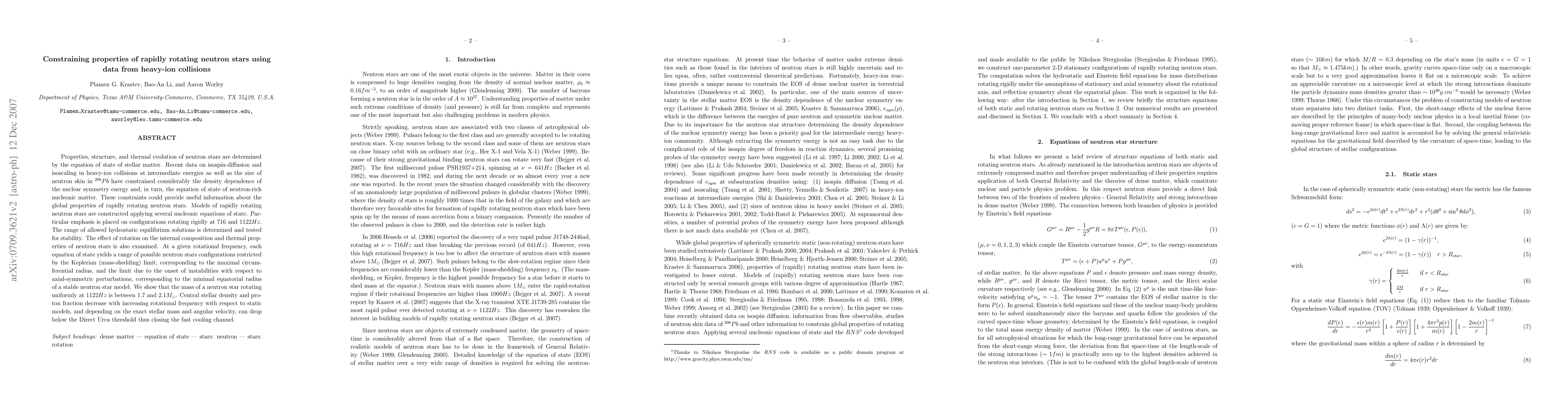 Properties, structure, and thermal evolution of neutron stars are determined by the equation of state of stellar matter. Recent data on isospin-diffusion and isoscaling in heavy-ion collisions at intermediate energies as well as the size of neutron skin in $^{208}Pb$ have constrained considerably the density dependence of the nuclear symmetry energy and, in turn, the equation of state of neutron-rich nucleonic matter. These constraints could provide useful information about the global properties of rapidly rotating neutron stars. Models of rapidly rotating neutron stars are constructed applying several nucleonic equations of state. Particular emphasis is placed on configurations rotating rigidly at $716$ and $1122Hz$. The range of allowed hydrostatic equilibrium solutions is determined and tested for stability. The effect of rotation on the internal composition and thermal properties of neutron stars is also examined. At a given rotational frequency, each equation of state yields a range of possible neutron stars configurations restricted by the Keplerian (mass-shedding) limit, corresponding to the maximal circumferential radius, and the limit due to the onset of instabilities with respect to axial-symmetric perturbations, corresponding to the minimal equatorial radius of a stable neutron star model. We show that the mass of a neutron star rotating uniformly at $1122Hz$ is between $1.7$ and $2.1M_{\sun}$. Central stellar density and proton fraction decrease with increasing rotational frequency with respect to static models, and depending on the exact stellar mass and angular velocity, can drop below the Direct Urca threshold thus closing the fast cooling channel.