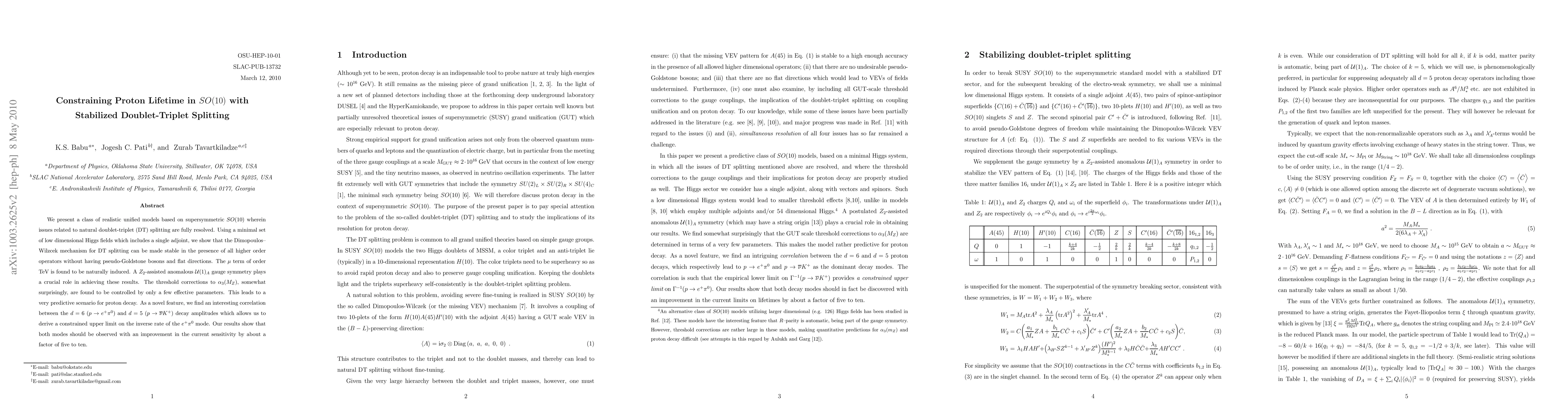 This paper proposes a supersymmetric SO(10) unified model that resolves doublet-triplet splitting issues and stabilizes the Dimopoulos-Wilzcek mechanism, leading to a predictive scenario for proton decay. It finds a correlation between d=6 and d=5 decay amplitudes, deriving a constrained upper limit on the inverse rate of proton decay via the d=6 mode, suggesting both decay modes should be observed with improved sensitivity.