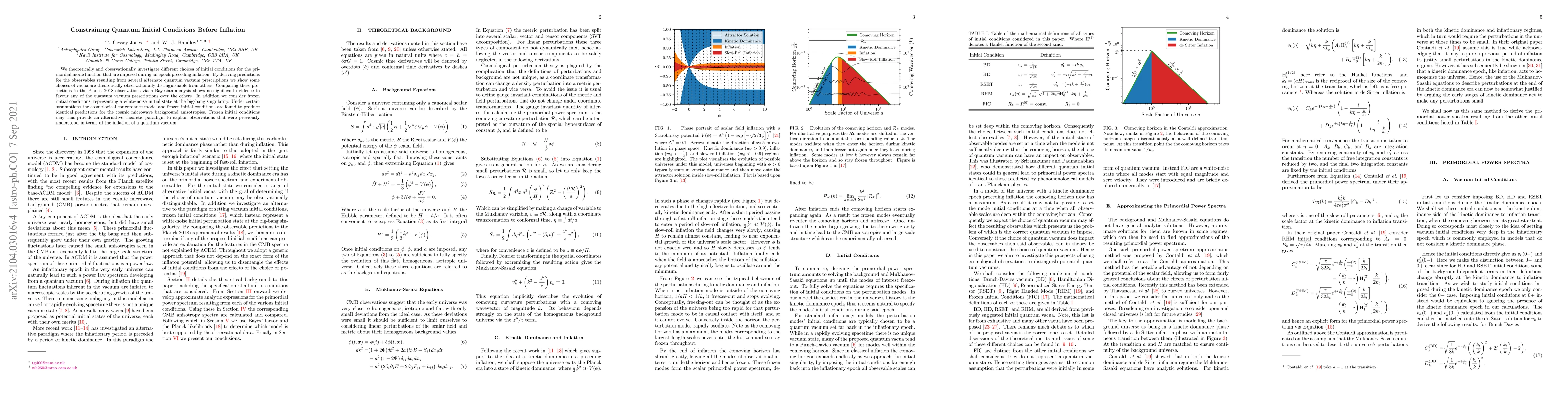 We theoretically and observationally investigate different choices of initial conditions for the primordial mode function that are imposed during an epoch preceding inflation. By deriving predictions for the observables resulting from several alternate quantum vacuum prescriptions we show some choices of vacua are theoretically observationally distinguishable from others. Comparing these predictions to the Planck 2018 observations via a Bayesian analysis shows no significant evidence to favour any of the quantum vacuum prescriptions over the others. In addition we consider frozen initial conditions, representing a white-noise initial state at the big-bang singularity. Under certain assumptions the cosmological concordance model and frozen initial conditions are found to produce identical predictions for the cosmic microwave background anisotropies. Frozen initial conditions may thus provide an alternative theoretic paradigm to explain observations that were previously understood in terms of the inflation of a quantum vacuum.