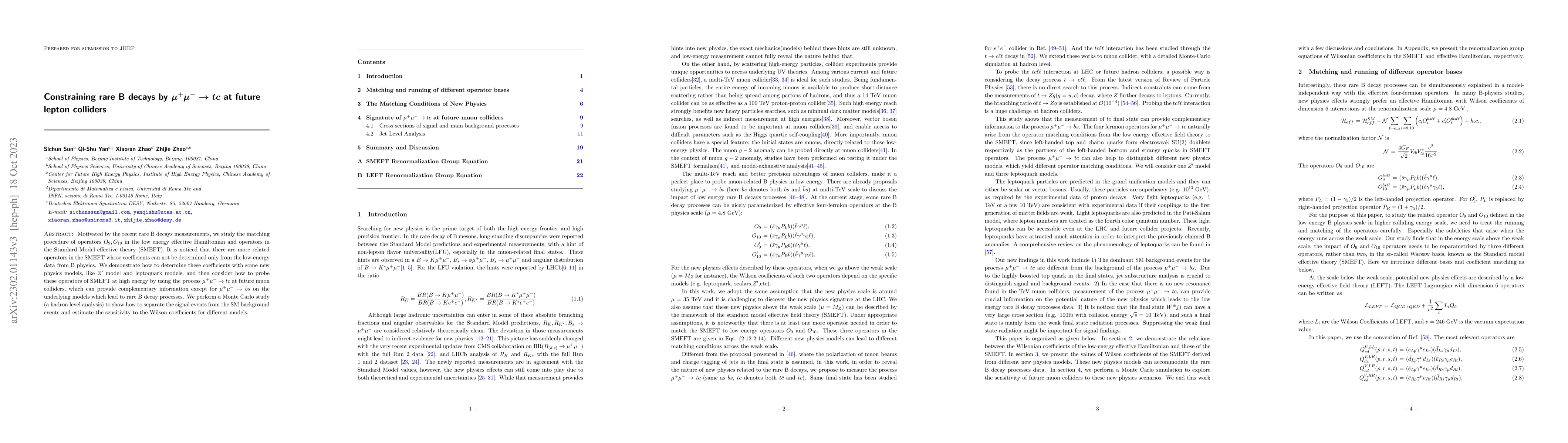 This paper explores the matching of operators $O_9$ and $O_{10}$ in the low-energy effective Hamiltonian and SMEFT, aiming to determine coefficients of related operators using new physics models like $Z^\prime$ and leptoquarks. It proposes probing these operators at future muon colliders via $\mu^+\mu^-\to tc$ to provide complementary insights into rare B decay processes.