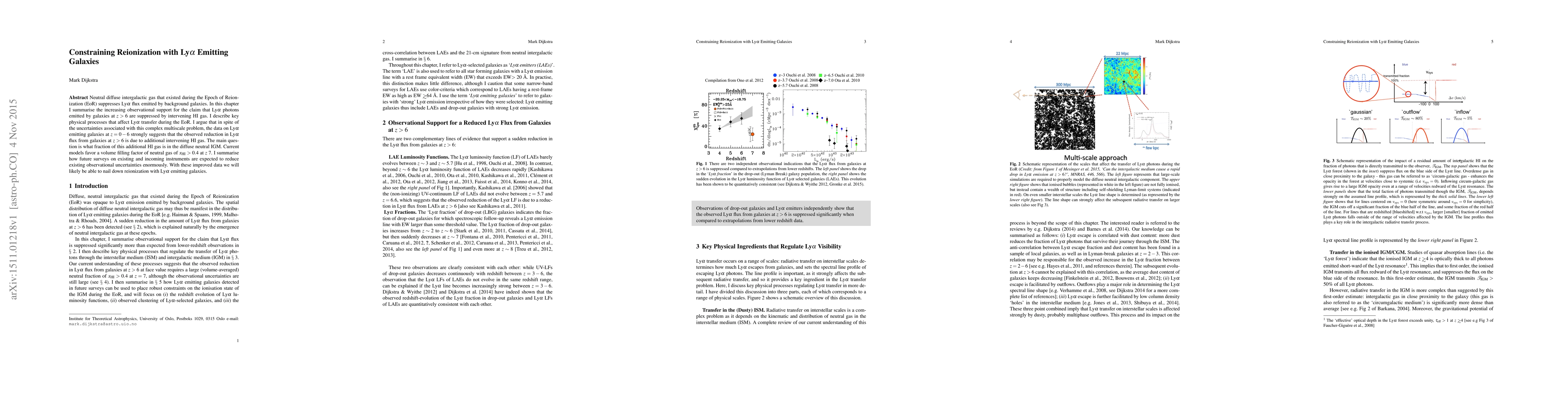 Neutral diffuse intergalactic gas that existed during the Epoch of Reionization (EoR) suppresses Lyman Alpha (Lya) flux emitted by background galaxies. In this chapter I summarise the increasing observational support for the claim that Lya photons emitted by galaxies at z>6 are suppressed by intervening HI gas. I describe key physical processes that affect Lya transfer during the EoR. I argue that in spite of the uncertainties associated with this complex multiscale problem, the data on Lya emitting galaxies at z=0-6 strongly suggests that the observed reduction in Lya flux from galaxies at z>6 is due to additional intervening HI gas. The main question is what fraction of this additional HI gas is in the diffuse neutral IGM. I summarise how future surveys on existing and upcoming instruments are expected to reduce existing observational uncertainties enormously. With these improved data we will likely be able to nail down reionization with Lya emitting galaxies.