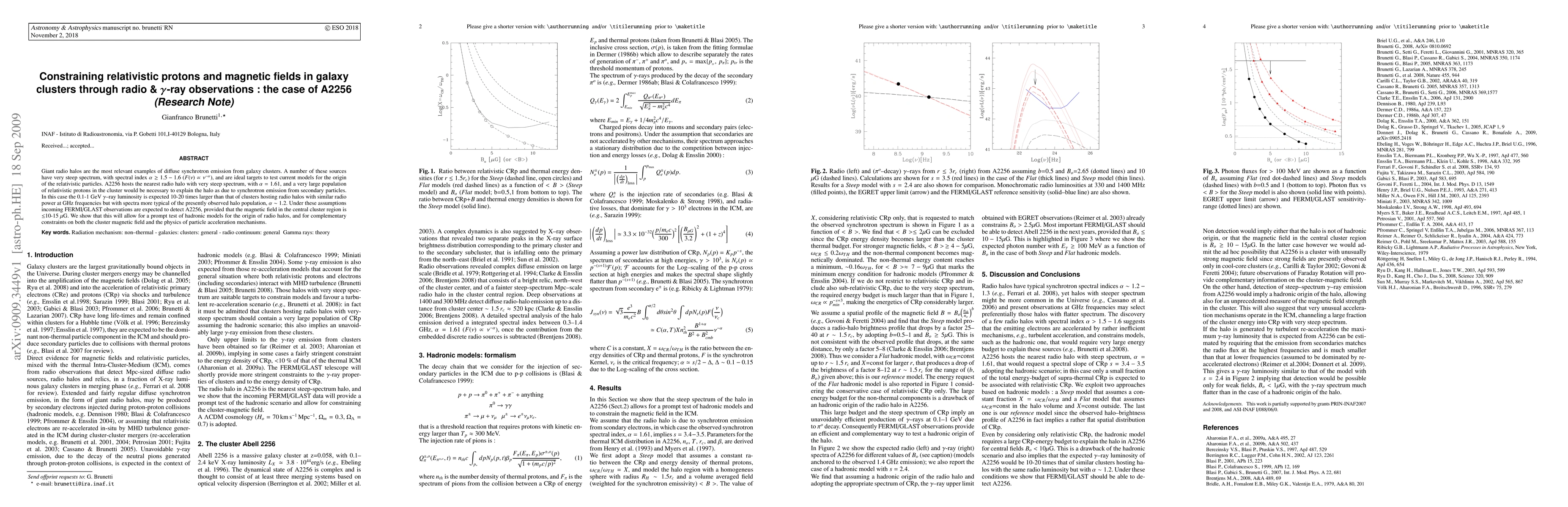 Giant radio halos are the most relevant examples of diffuse synchrotron emission from galaxy clusters. A number of these sources have very steep spectrum, with spectral index $\alpha \geq 1.5-1.6$ ($F(\nu) \propto \nu^{-\alpha}$), and are ideal targets to test current models for the origin of the relativistic particles. A2256 hosts the nearest radio halo with very steep spectrum, with $\alpha =1.61$, and a very large population of relativistic protons in the cluster would be necessary to explain the halo as due to synchrotron emission from secondary particles. In this case the 0.1-1 GeV $\gamma$--ray luminosity is expected 10-20 times larger than that of clusters hosting radio halos with similar radio power at GHz frequencies but with spectra more typical of the presently observed halo population, $\alpha \sim 1.2$. Under these assumptions incoming FERMI/GLAST observations are expected to detect A2256, provided that the magnetic field in the central cluster region is $\leq$10-15 $\mu$G. We show that this will allow for a prompt test of hadronic models for the origin of radio halos, and for complementary constraints on both the cluster magnetic field and the physics of particle acceleration mechanisms.