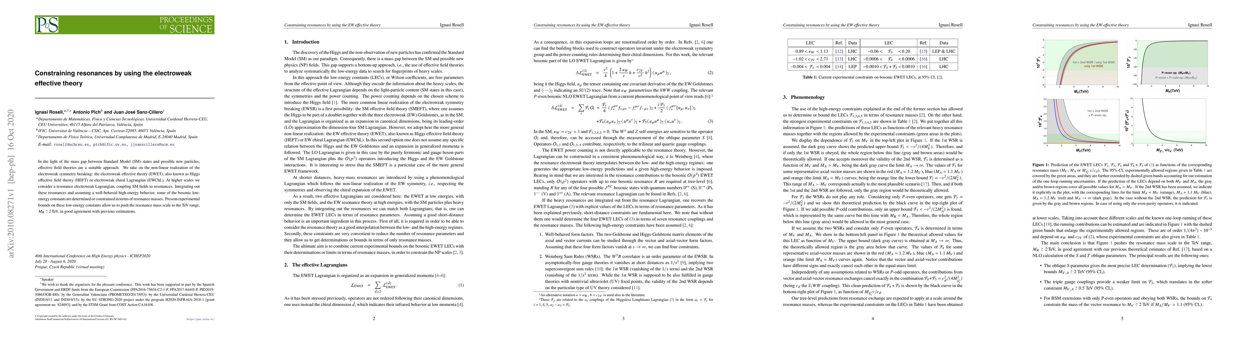 This paper utilizes the electroweak effective theory to constrain the masses of potential new resonances by integrating them out, determining low-energy constants in terms of resonance masses. Experimental bounds on these constants suggest resonance masses should be at least 2 TeV, aligning with previous estimates.