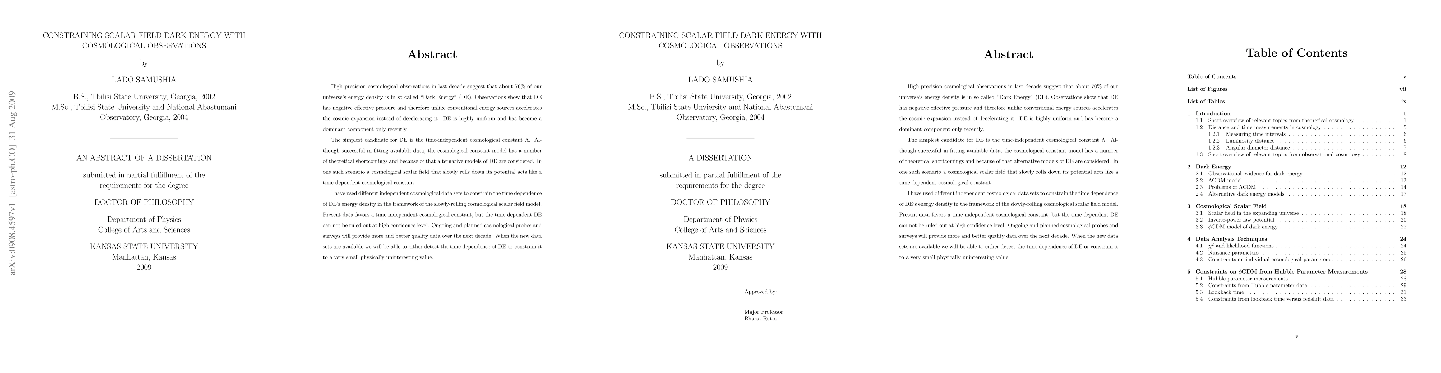 High precision cosmological observations in last decade suggest that about 70% of our universe's energy density is in so called "Dark Energy" (DE). Observations show that DE has negative effective pressure and therefore unlike conventional energy sources accelerates the cosmic expansion instead of decelerating it. DE is highly uniform and has become a dominant component only recently. The simplest candidate for DE is the time-independent cosmological constant $\Lambda$. Although successful in fitting available data, the cosmological constant model has a number of theoretical shortcomings and because of that alternative models of DE are considered. In one such scenario a cosmological scalar field that slowly rolls down its potential acts like a time-dependent cosmological constant. I have used different independent cosmological data sets to constrain the time dependence of DE's energy density in the framework of the slowly-rolling cosmological scalar field model. Present data favors a time-independent cosmological constant, but the time-dependent DE can not be ruled out at high confidence level. Ongoing and planned cosmological probes and surveys will provide more and better quality data over the next decade. When the new data sets are available we will be able to either detect the time dependence of DE or constrain it to a very small physically uninteresting value.