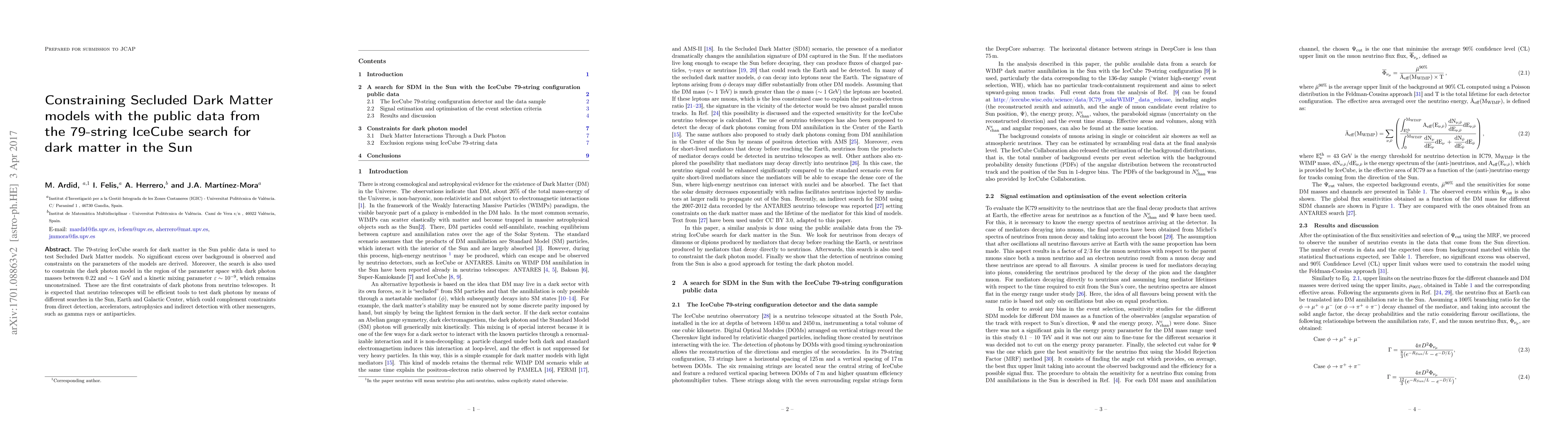 This paper uses IceCube's 79-string data to constrain Secluded Dark Matter models and dark photon parameters, finding no significant excess. It provides the first constraints on dark photons from neutrino telescopes, suggesting their potential to complement other detection methods.