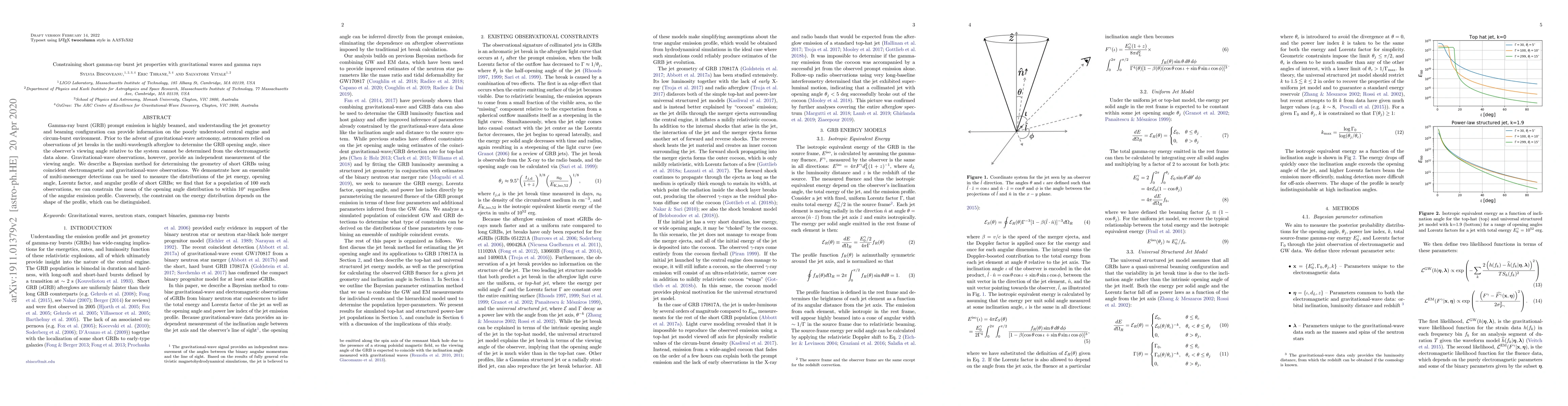 Gamma-ray burst (GRB) prompt emission is highly beamed, and understanding the jet geometry and beaming configuration can provide information on the poorly understood central engine and circum-burst environment. Prior to the advent of gravitational-wave astronomy, astronomers relied on observations of jet breaks in the multi-wavelength afterglow to determine the GRB opening angle, since the observer's viewing angle relative to the system cannot be determined from the electromagnetic data alone. Gravitational-wave observations, however, provide an independent measurement of the viewing angle. We describe a Bayesian method for determining the geometry of short GRBs using coincident electromagnetic and gravitational-wave observations. We demonstrate how an ensemble of multi-messenger detections can be used to measure the distributions of the jet energy, opening angle, Lorentz factor, and angular profile of short GRBs; we find that for a population of 100 such observations, we can constrain the mean of the opening angle distribution to within 10 degrees regardless of the angular emission profile. Conversely, the constraint on the energy distribution depends on the shape of the profile, which can be distinguished.