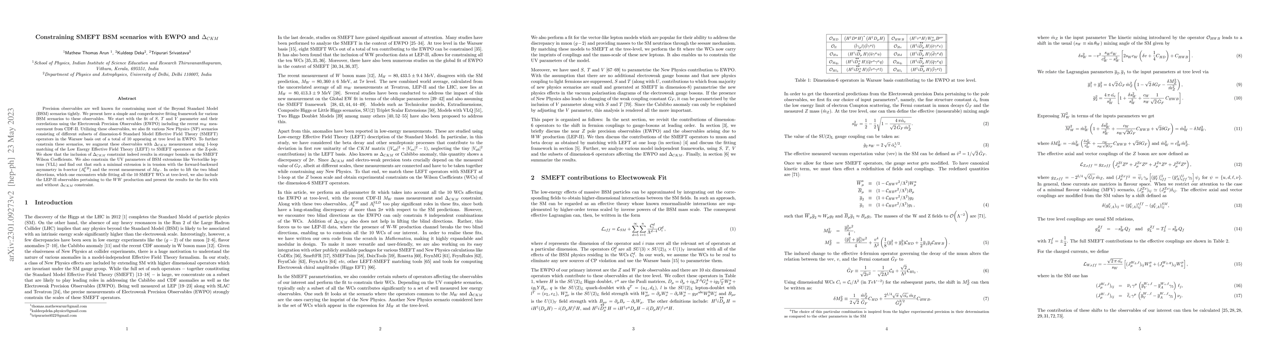 Precision observables are well known for constraining most of the Beyond Standard Model (BSM) scenarios tightly. We present here a simple and comprehensive fitting framework for various BSM scenarios to these observables. We start with the fit of $S$, $T$ and $V$ parameter and their correlations using the Electroweak Precision Observables (EWPO) including the recent $m_W$ measurement from CDF-II. Utilizing these observables, we also fit various New Physics (NP) scenarios consisting of different subsets of dimension-6 Standard Model Effective Field Theory (SMEFT) operators in the Warsaw basis out of a total of 10 appearing at tree level in EWPO. To further constrain these scenarios, we augment these observables with $\Delta_{CKM}$ measurement using 1-loop matching of the Low Energy Effective Field Theory (LEFT) to SMEFT operators at the Z-pole. We show that the inclusion of $\Delta_{CKM}$ constraint indeed results in stronger bounds on the SMEFT Wilson Coefficients. We also constrain the UV parameters of BSM extensions like Vectorlike leptons (VLL) and find out that such a minimal extension is in tension with the forward-backward asymmetry in $b$-sector ($A_b^{FB}$) and the recent measurement of $M_W$. In order to lift the two blind directions, which one encounters while fitting all the 10 SMEFT WCs at tree-level, we also include the LEP-II observables pertaining to the $WW$ production and present the results for the fits with and without $\Delta_{CKM}$ constraint.