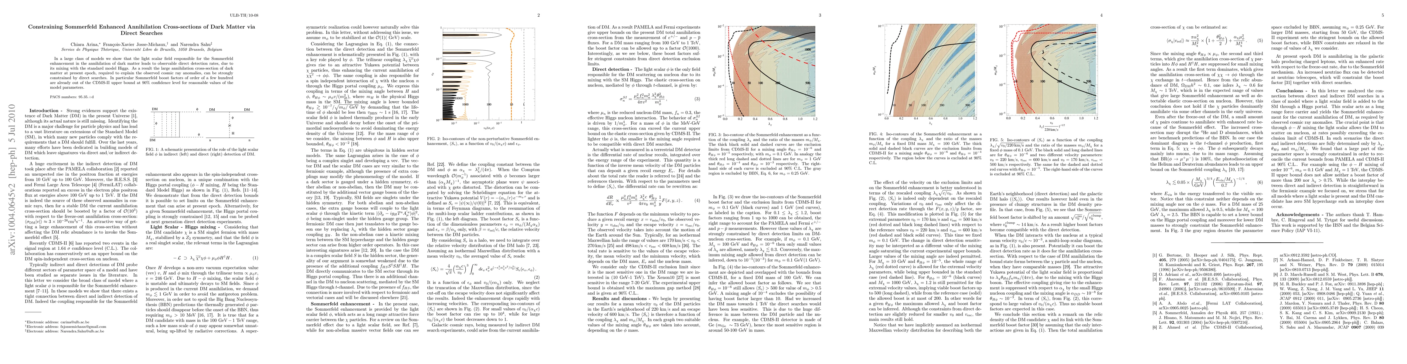 In a large class of models we show that the light scalar field responsible for the Sommerfeld enhancement in the annihilation of dark matter leads to observable direct detection rates, due to its mixing with the standard model Higgs. As a result the large annihilation cross-section of dark matter at present epoch, required to explain the observed cosmic ray anomalies, can be strongly constrained by direct searches. In particular Sommerfeld boost factors of order of a few hundred are already out of the CDMS-II upper bound at 90% confidence level for reasonable values of the model parameters.