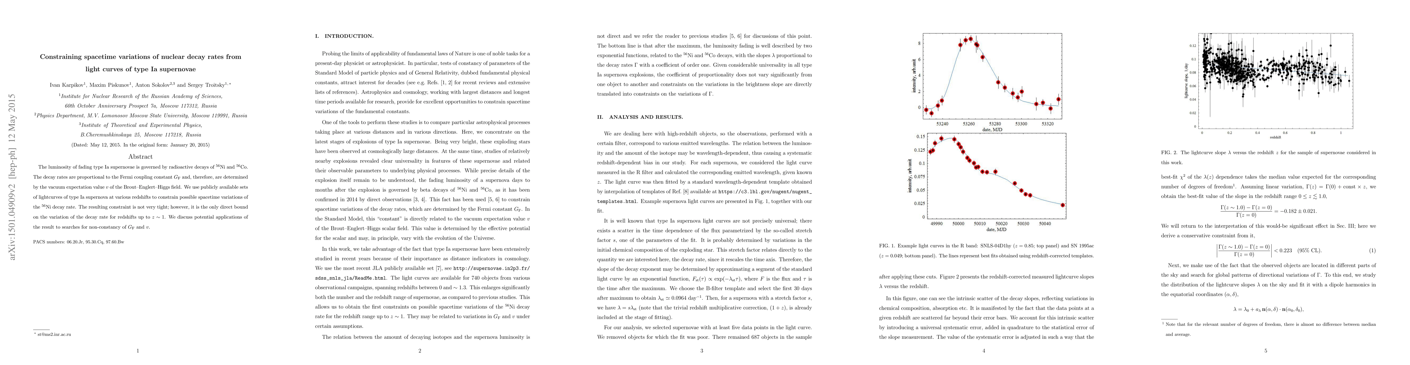The luminosity of fading type Ia supernovae is governed by radioactive decays of 56Ni and 56Co. The decay rates are proportional to the Fermi coupling constant G_F and, therefore, are determined by the vacuum expectation value v of the Brout-Englert-Higgs field. We use publicly available sets of light curves of type Ia supernova at various redshifts to constrain possible spacetime variations of the 56Ni decay rate. The resulting constraint is not very tight; however, it is the only direct bound on the variation of the decay rate for redshifts up to z~1. We discuss potential applications of the result to searches for non-constancy of G_F and v.