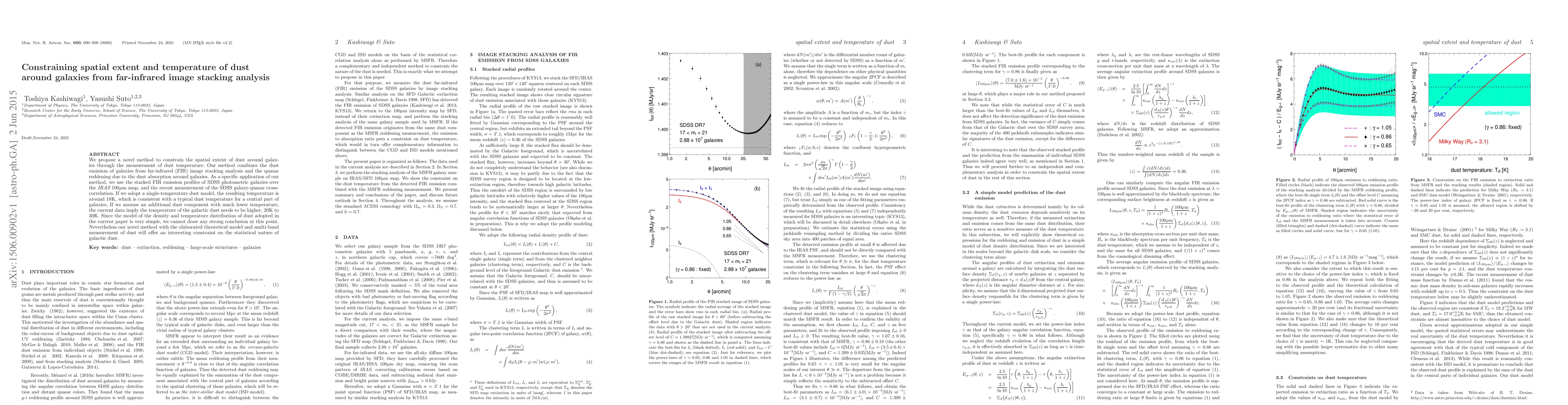 This paper introduces a novel method to measure the spatial extent and temperature of dust around galaxies using far-infrared image stacking and quasar reddening data. The analysis suggests a dust temperature around 18K, but with additional lower-temperature components, the temperature could be higher, ranging from 20K to 30K.