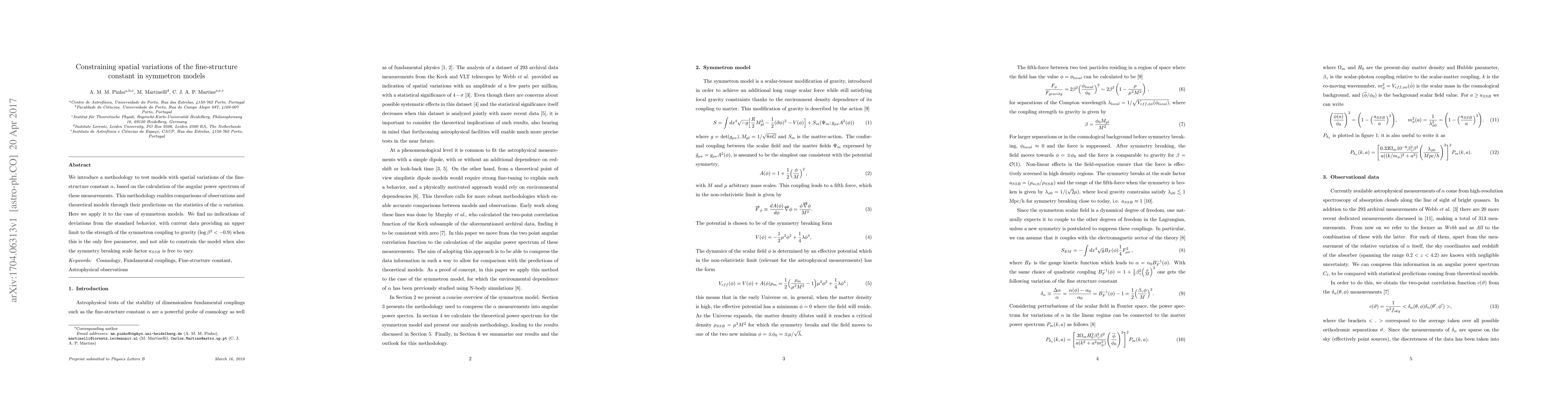 This paper develops a new method to test symmetron models that allow for spatial variations in the fine-structure constant $\alpha$, finding no deviations from standard behavior. Current data set an upper limit on the strength of the symmetron coupling to gravity ($\log{\beta^2}<-0.9$).