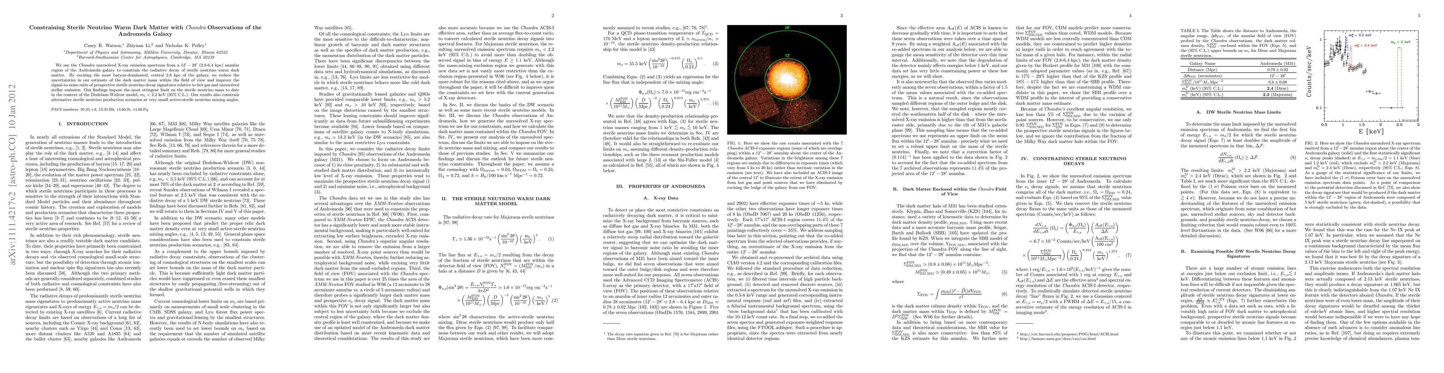 This study uses Chandra X-ray observations of the Andromeda galaxy to constrain sterile neutrino warm dark matter by analyzing its radiative decay. The research sets a stringent limit on sterile neutrino mass at m_s < 2.2 keV (95% C.L.), improving previous constraints and also limiting small active-sterile neutrino mixing angles.