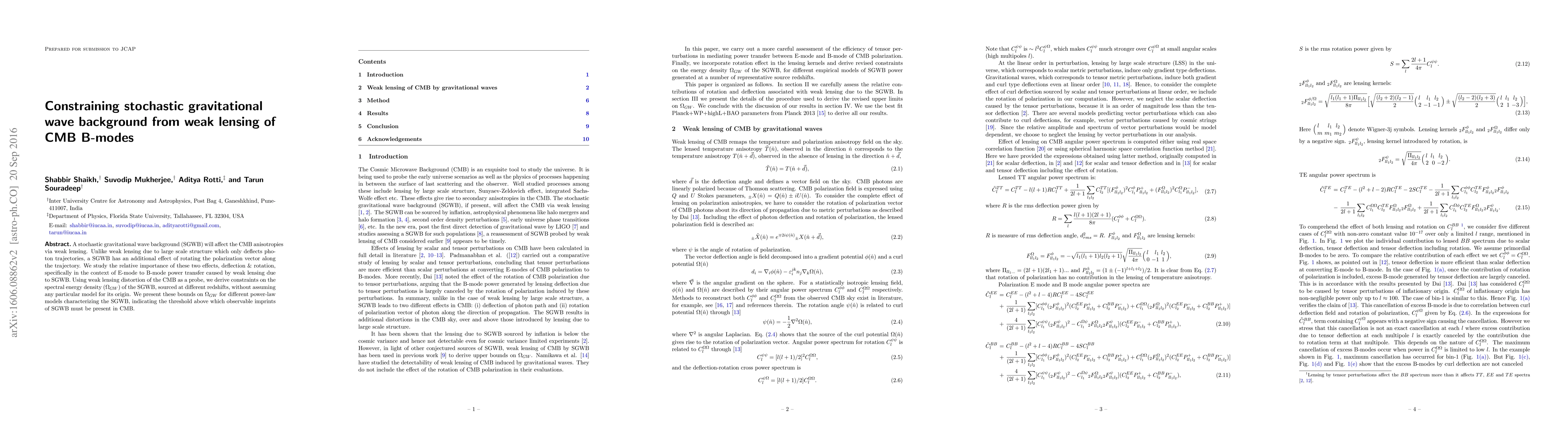 A stochastic gravitational wave background (SGWB) will affect the CMB anisotropies via weak lensing. Unlike weak lensing due to large scale structure which only deflects photon trajectories, a SGWB has an additional effect of rotating the polarization vector along the trajectory. We study the relative importance of these two effects, deflection \& rotation, specifically in the context of E-mode to B-mode power transfer caused by weak lensing due to SGWB. Using weak lensing distortion of the CMB as a probe, we derive constraints on the spectral energy density ($\Omega_{GW}$) of the SGWB, sourced at different redshifts, without assuming any particular model for its origin. We present these bounds on $\Omega_{GW}$ for different power-law models characterizing the SGWB, indicating the threshold above which observable imprints of SGWB must be present in CMB.