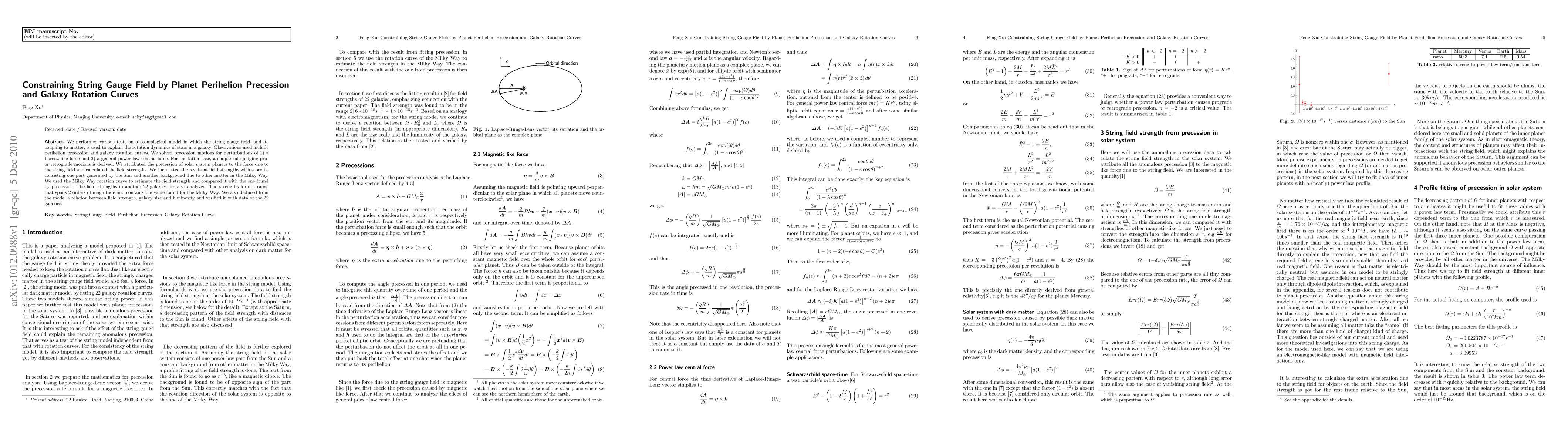 This paper explores a cosmological model using string gauge fields to explain galaxy rotation dynamics and solar system perihelion precession. It derives field strengths from both solar system observations and galaxy rotation curves, finding consistency across multiple galaxies and verifying a relation between field strength, galaxy size, and luminosity.