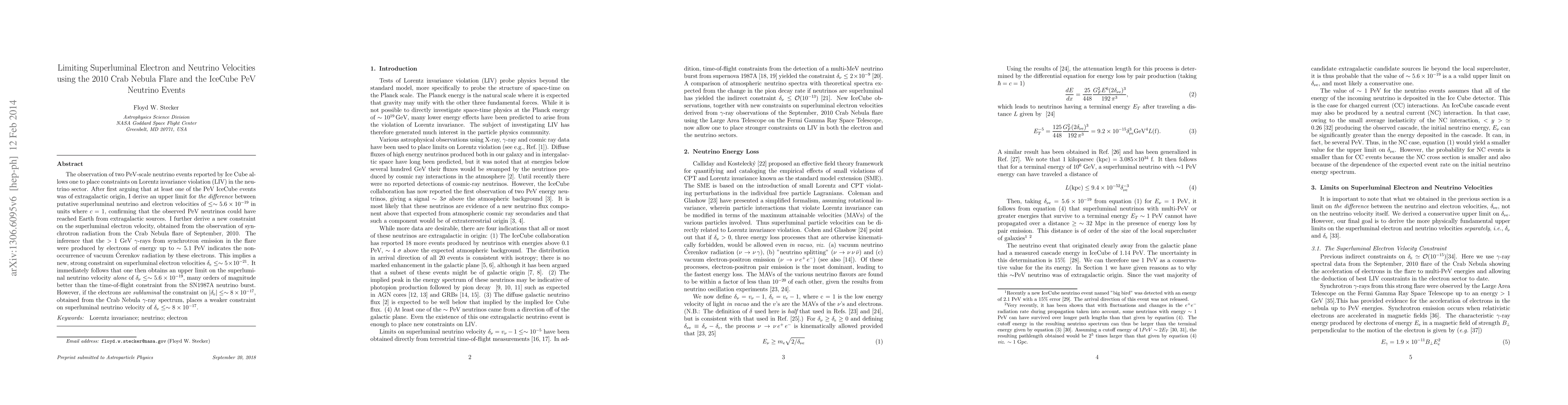 The observation of two PeV-scale neutrino events reported by Ice Cube can, in principle, allows one to place constraints on Lorentz invariance violation (LIV) in the neutrino sector. After first arguing that at least one of the IceCube events was of extragalactic origin, I derive an upper limit for {\it the difference} between putative superluminal neutrino and electron velocities of $\le \sim 5.6 \times 10^{-19}$ in units where $c = 1$, confirming that the observed PeV neutrinos could have reached Earth from extragalactic sources. I further derive a new constraint on the superluminal electron velocity, obtained from the observation of synchrotron radiation in the Crab Nebula flare of September, 2010. The inference that the $>$ 1 GeV $\gamma$-rays from synchrotron emission in the flare were produced by electrons of energy up to $\sim 5.1$ PeV indicates the non-occurrence of vacuum \'{C}erenkov radiation by these electrons. This implies a new, strong constraint on superluminal electron velocities $\delta_e \le \sim 5 \times 10^{-21}$. It immediately follows that one then obtains an upper limit on the superluminal neutrino velocity {\it alone} of $\delta_{\nu} \le \sim 5.6 \times 10^{-19}$, many orders of magnitude better than the time-of-flight constraint from the SN1987A neutrino burst. However, if the electrons are {\it subluminal} the constraint on $|\delta_e| \le \sim 8 \times 10^{-17}$, obtained from the Crab Nebula $\gamma$-ray spectrum, places a weaker constraint on superluminal neutrino velocity of $\delta_{\nu} \le \sim 8 \times 10^{-17}$.