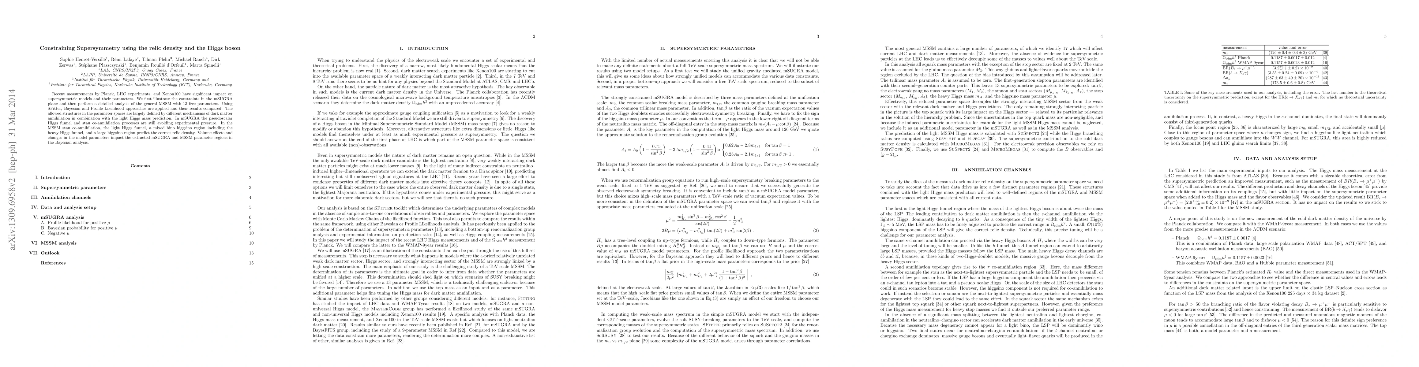 Recent measurements by Planck, LHC experiments, and Xenon100 have significant impact on supersymmetric models and their parameters. We first illustrate the constraints in the mSUGRA plane and then perform a detailed analysis of the general MSSM with 13 free parameters. Using SFitter, Bayesian and Profile Likelihood approaches are applied and their results compared. The allowed structures in the parameter spaces are largely defined by different mechanisms of dark matter annihilation in combination with the light Higgs mass prediction. In mSUGRA the pseudoscalar Higgs funnel and stau co-annihilation processes are still avoiding experimental pressure. In the MSSM stau co-annihilation, the light Higgs funnel, a mixed bino--higgsino region including the heavy Higgs funnel, and a large higgsino region predict the correct relic density. Volume effects and changes in the model parameters impact the extracted mSUGRA and MSSM parameter regions in the Bayesian analysis.