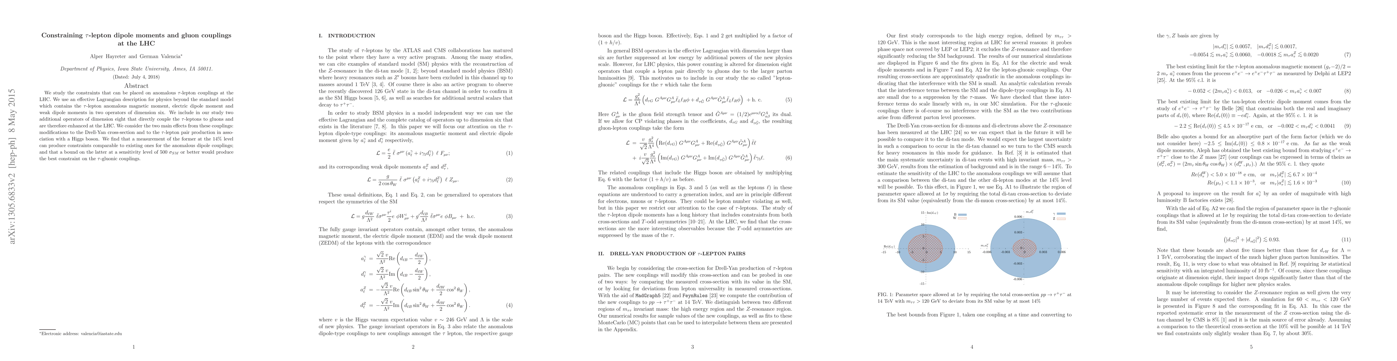 This paper investigates the constraints on anomalous $\tau$-lepton couplings, including magnetic and electric dipole moments, using an effective Lagrangian approach at the LHC. It finds that a 14% measurement of the Drell-Yan cross-section can match existing constraints, while a sensitivity of $500\ \sigma_{SM}$ on $\tau$-lepton pair production with Higgs bosons offers the best constraint on $\tau$-gluon couplings.